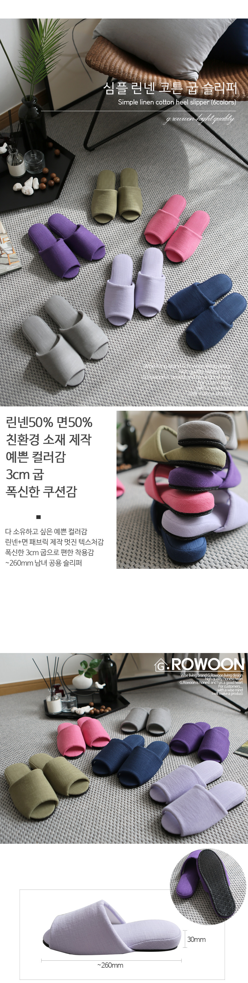 ?[ 친환경 린넨 면 제작 / 층간소음완화 / 예쁜 컬러감 / 사무실 거실 실내화 / 3cm 굽 폭신한 쿠션감 / 6컬러 / ~260mm 남녀공용 / 물세탁가능 ]