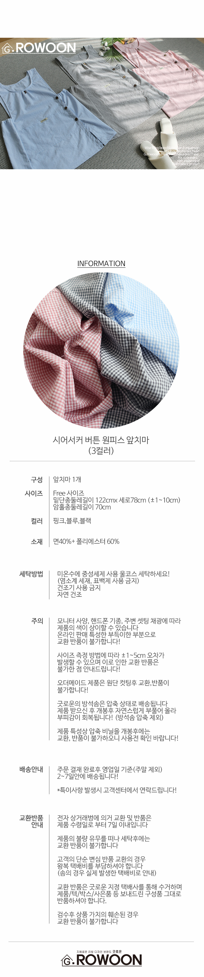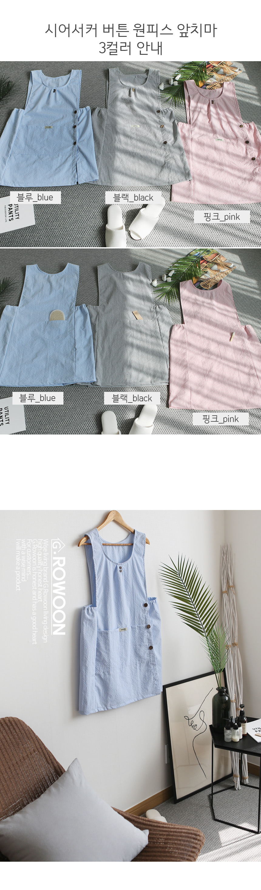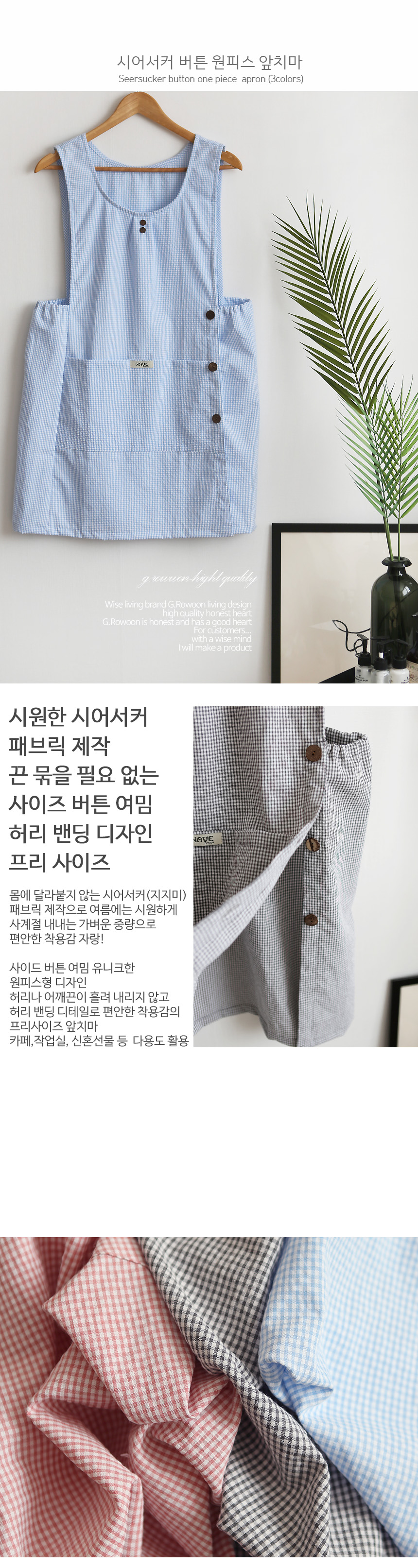 ?[ 시원한 시어서커 면혼방 패브릭 제작 / 사이드 버튼 편리한 원피스형 디자인 / 예쁜디자인 & 컬러 / free 사이즈 / 가볍고 편안한 착용감 / 카페 공방 주방 바리스타 신혼집 선물 앞치마 ]
