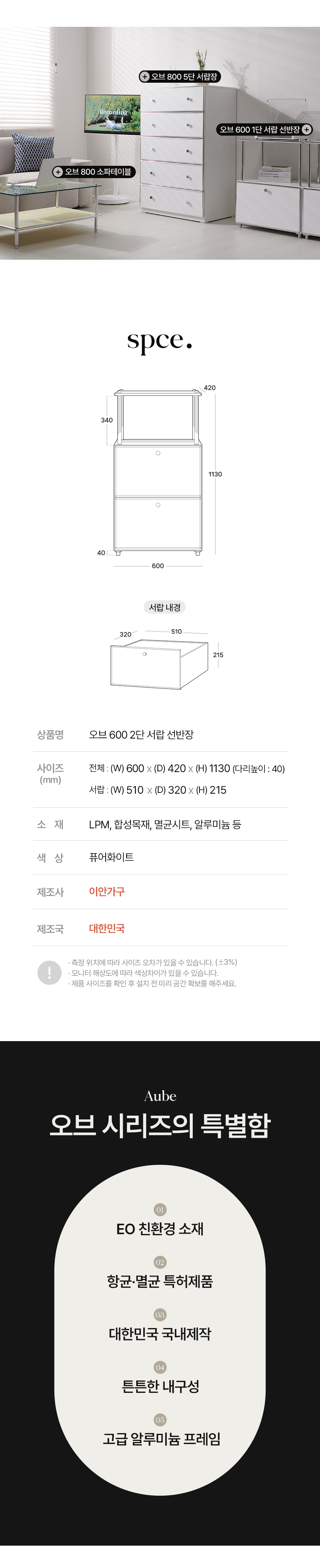 오브 모듈 2단 600 서랍장 국내생산 항균특허 선반 틈새 수납 콘솔