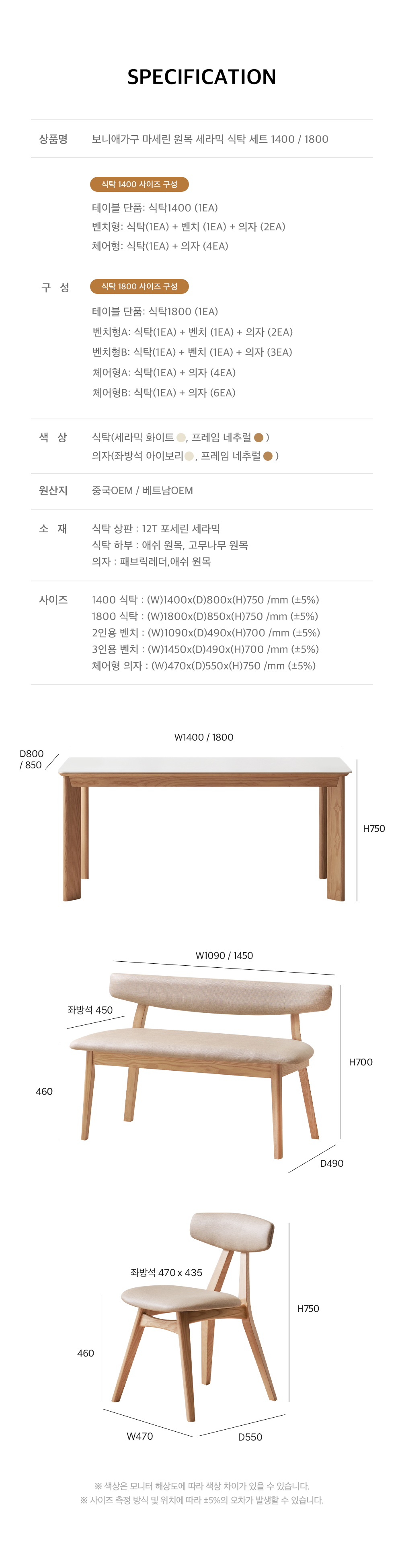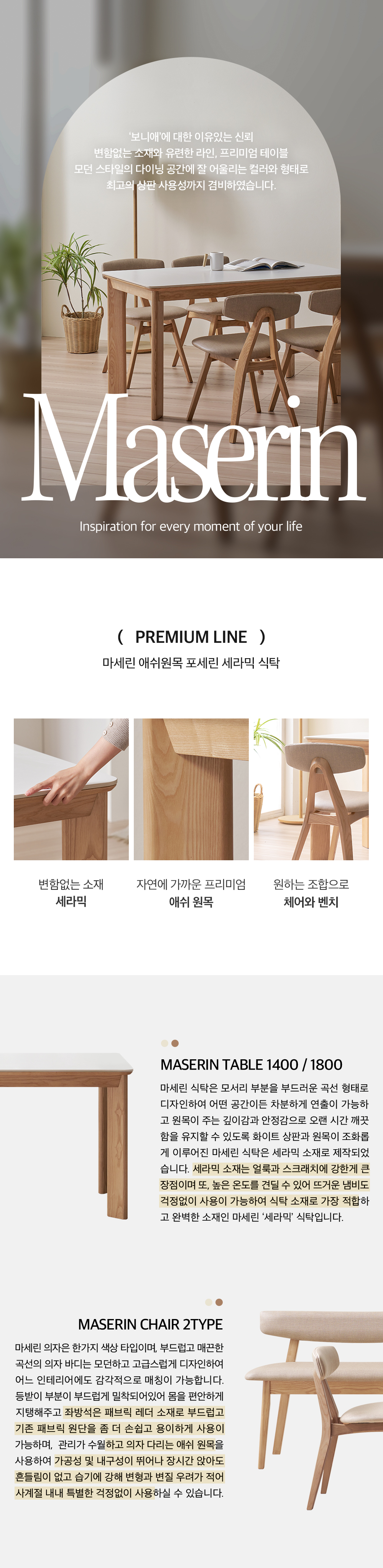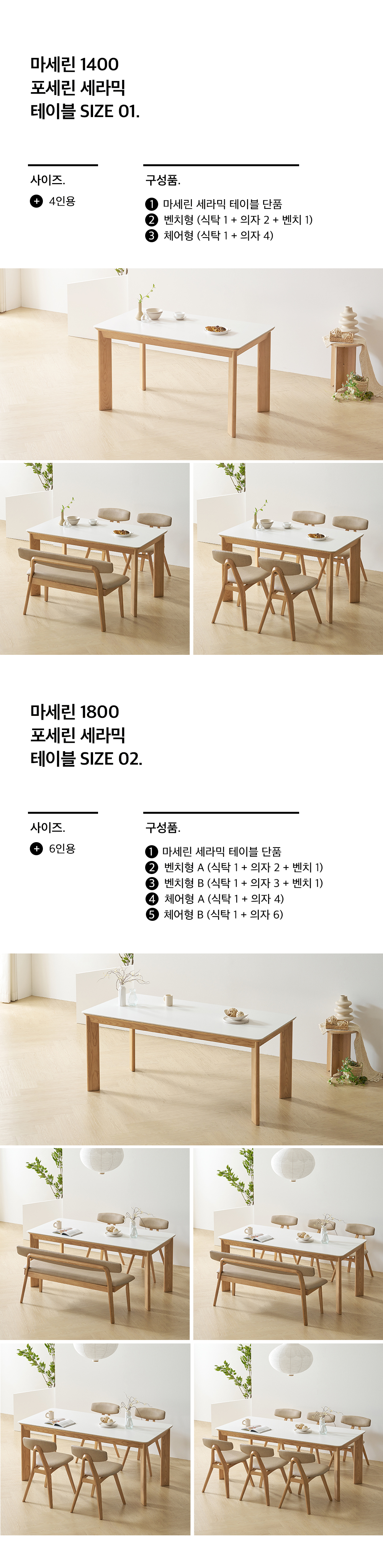 보니애가구 마세린 애쉬 원목 통 세라믹식탁 1400 1800 4인용 6인용 포세린 화이트 식탁