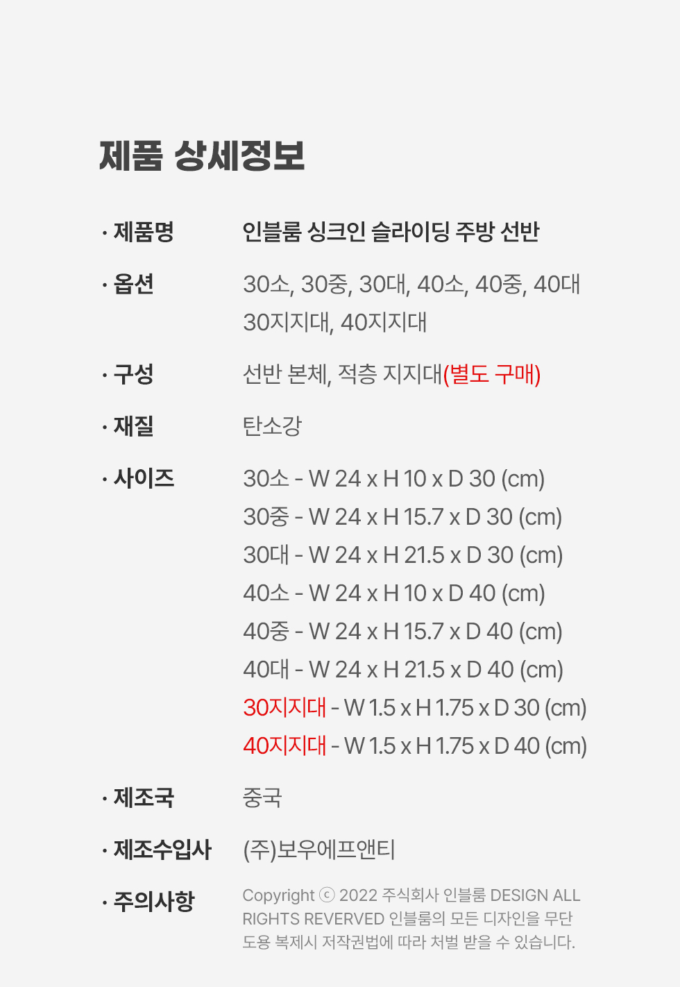 인블룸 싱크인 슬라이딩 주방선반 6size