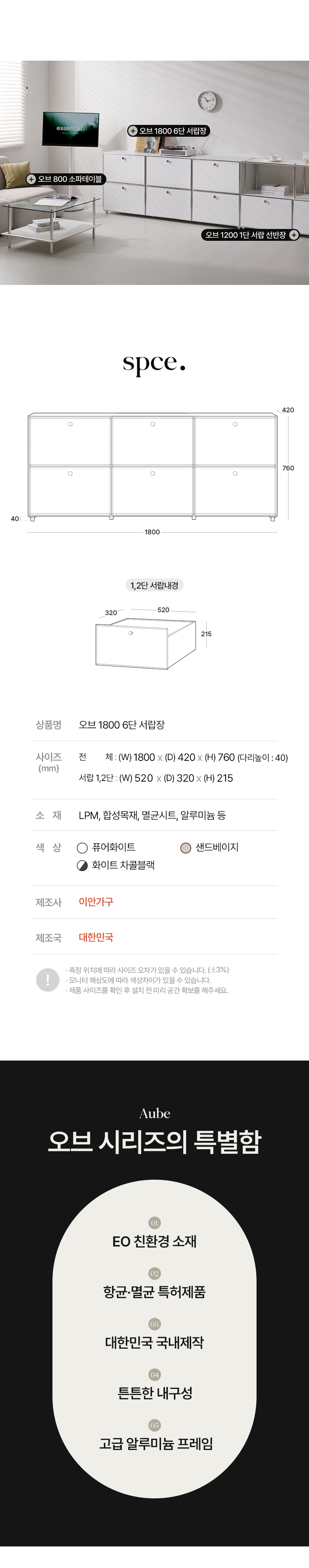 오브 모듈 2단 1800 6서랍 와이드 서랍장 수납 거실장