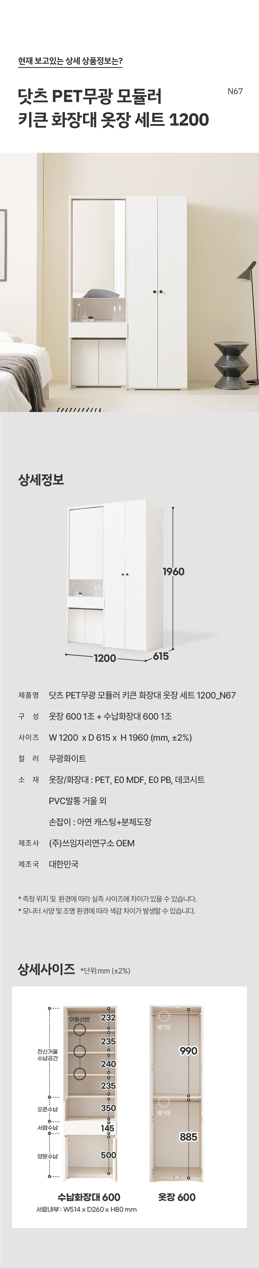 닷츠 PET무광 모듈러 키큰 화장대 옷장 세트 1200 N67