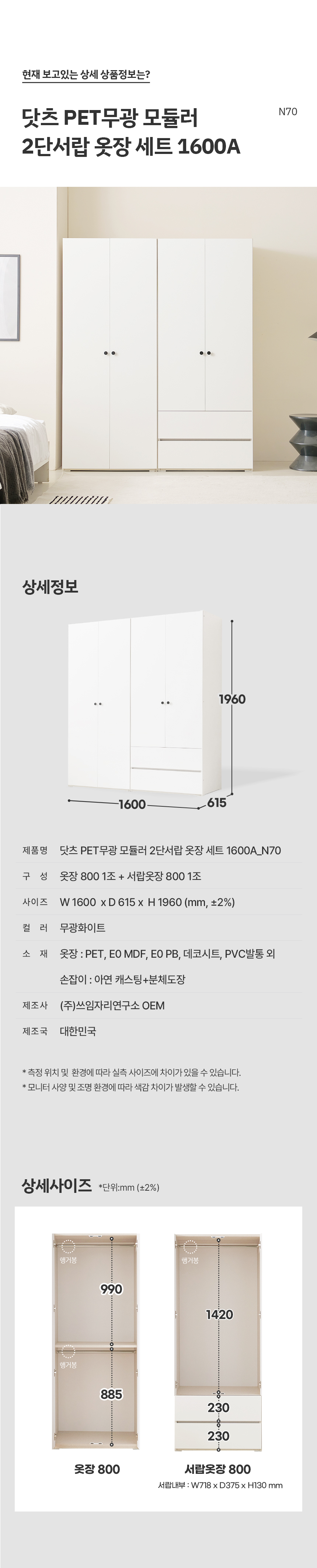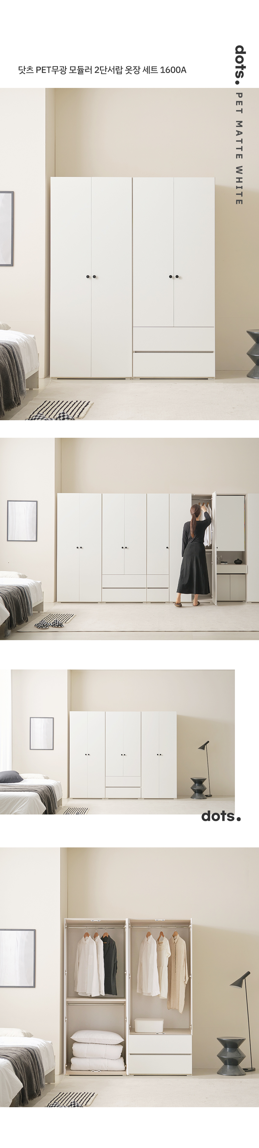 닷츠 PET무광 모듈러 2단서랍 옷장 세트 1600A N70