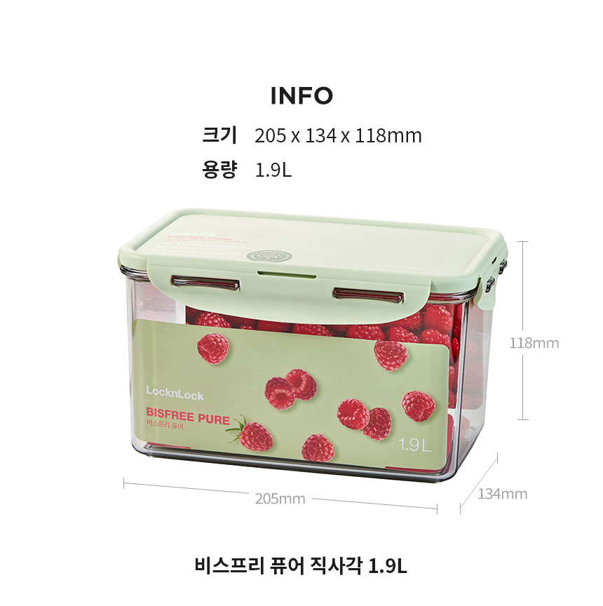 락앤락 비스프리 퓨어 직사각 1.9L 라이트그린 밀폐용기 반찬통 플라스틱통 소분용기 냉동용기 LBF818LG
