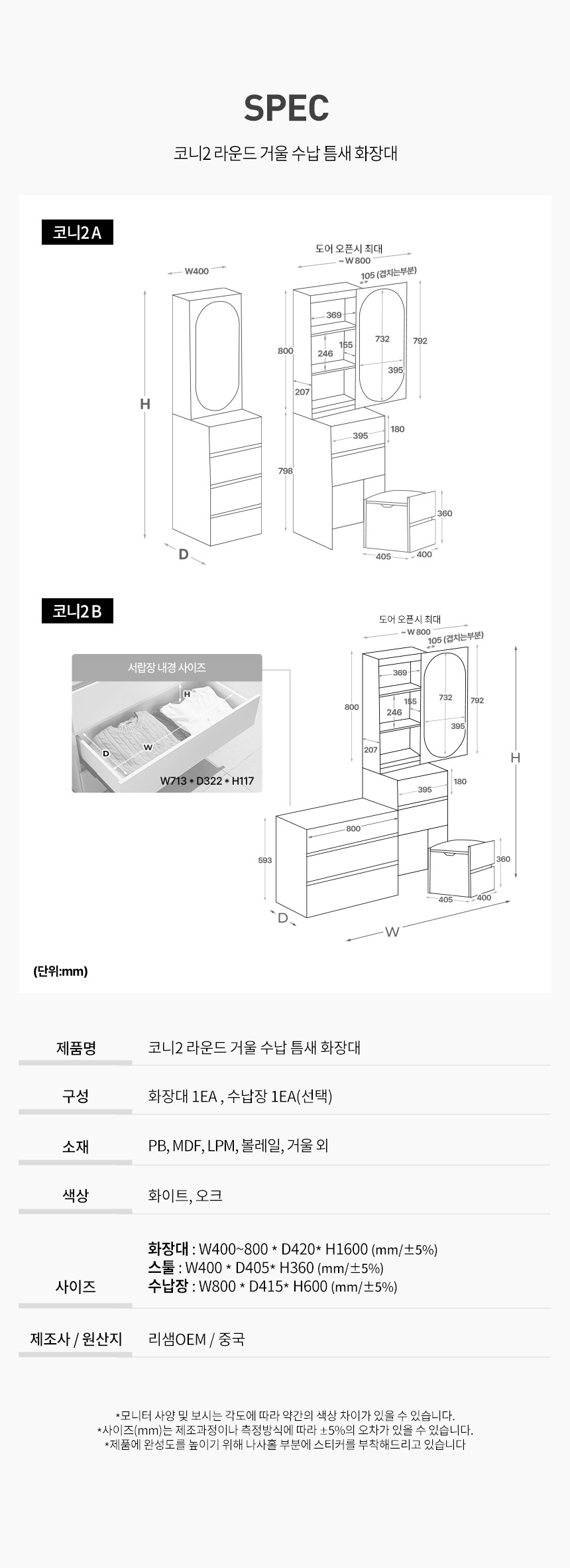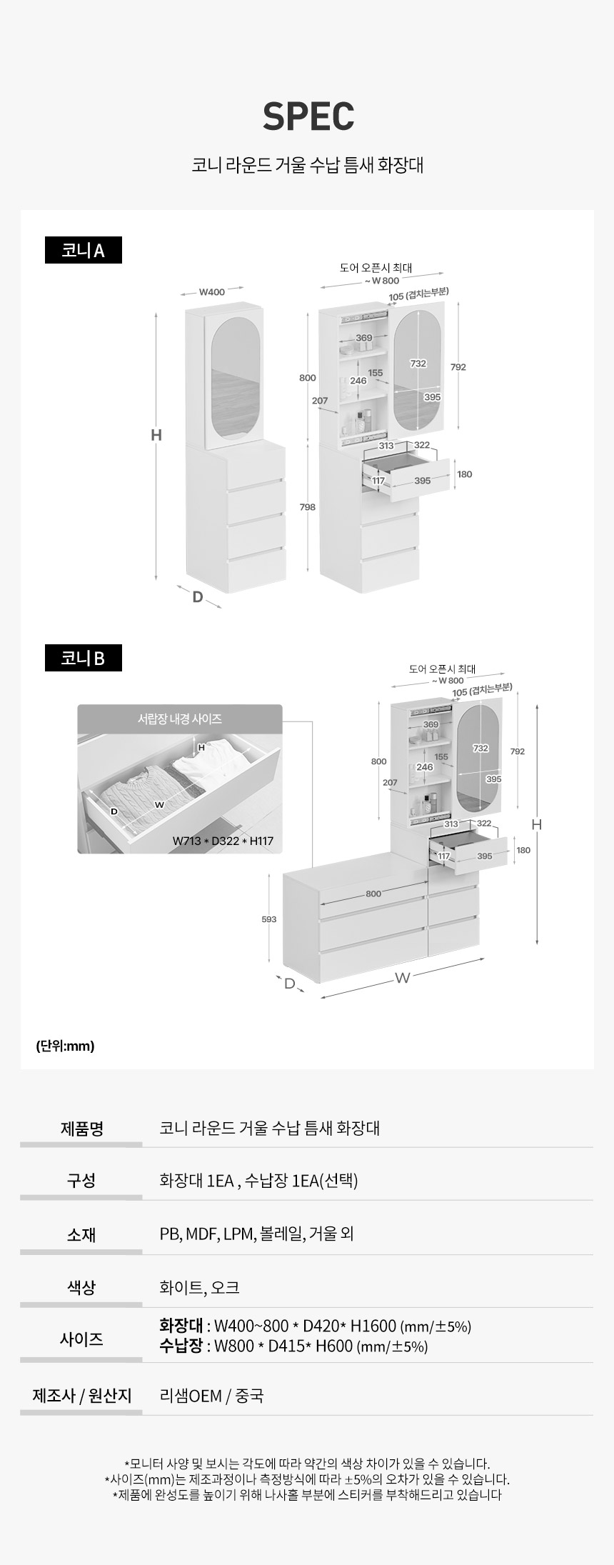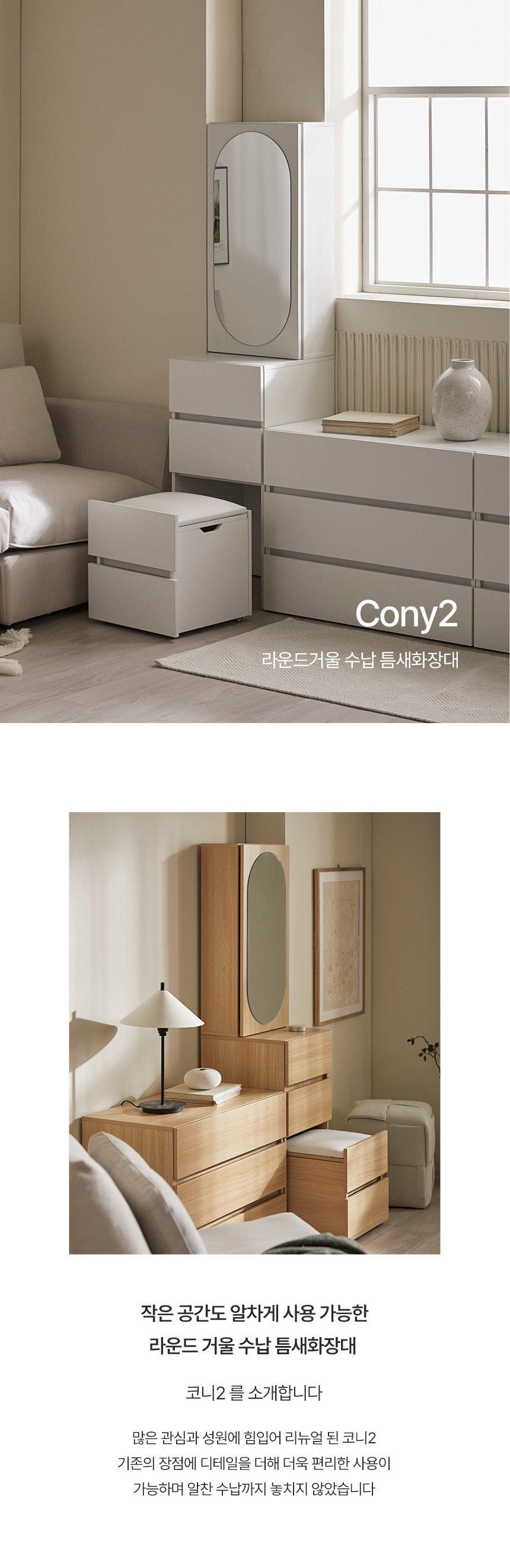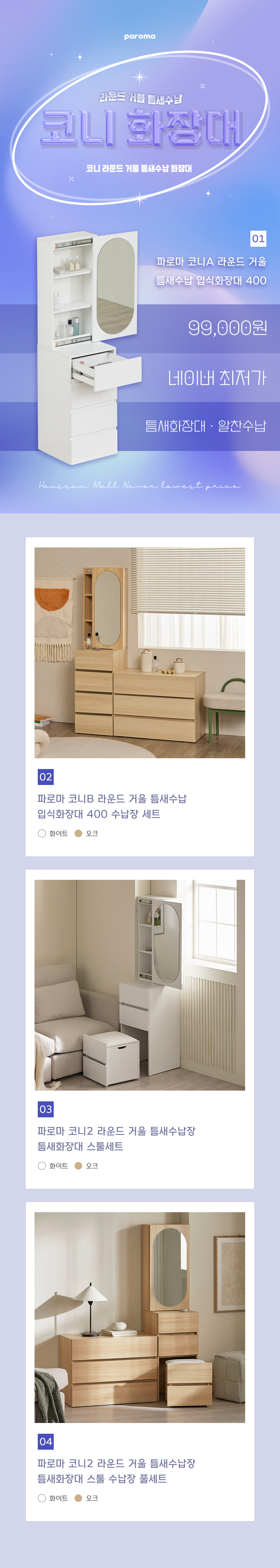 [특가 ~2/9]최종 구매가 99,000 // 파로마 코니A 라운드 거울 틈새수납 입식화장대 400
