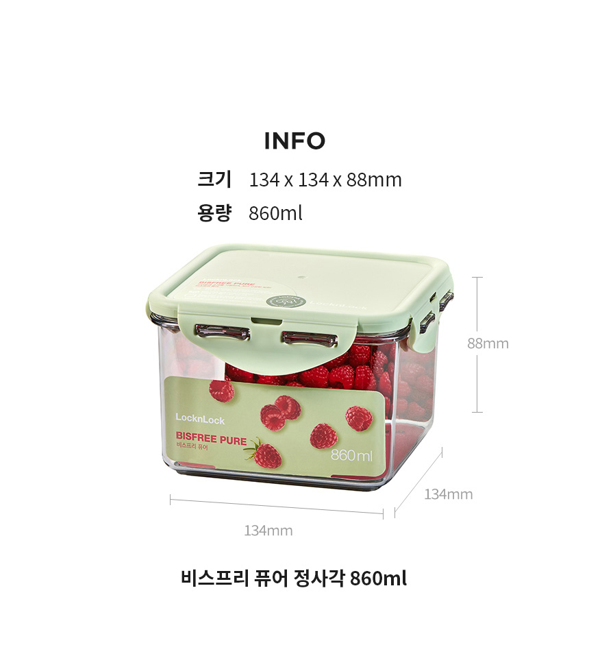 락앤락 비스프리 퓨어 정사각 860ml 라이트그린 밀폐용기 반찬통 플라스틱통 소분용기 냉동용기 LBF855LG