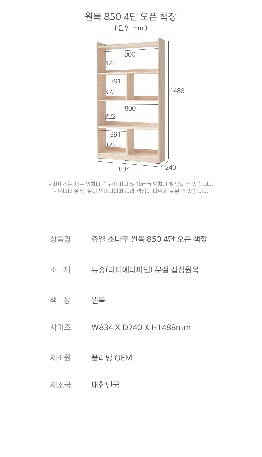 쥬엘 850 소나무 원목 4단 오픈 책장