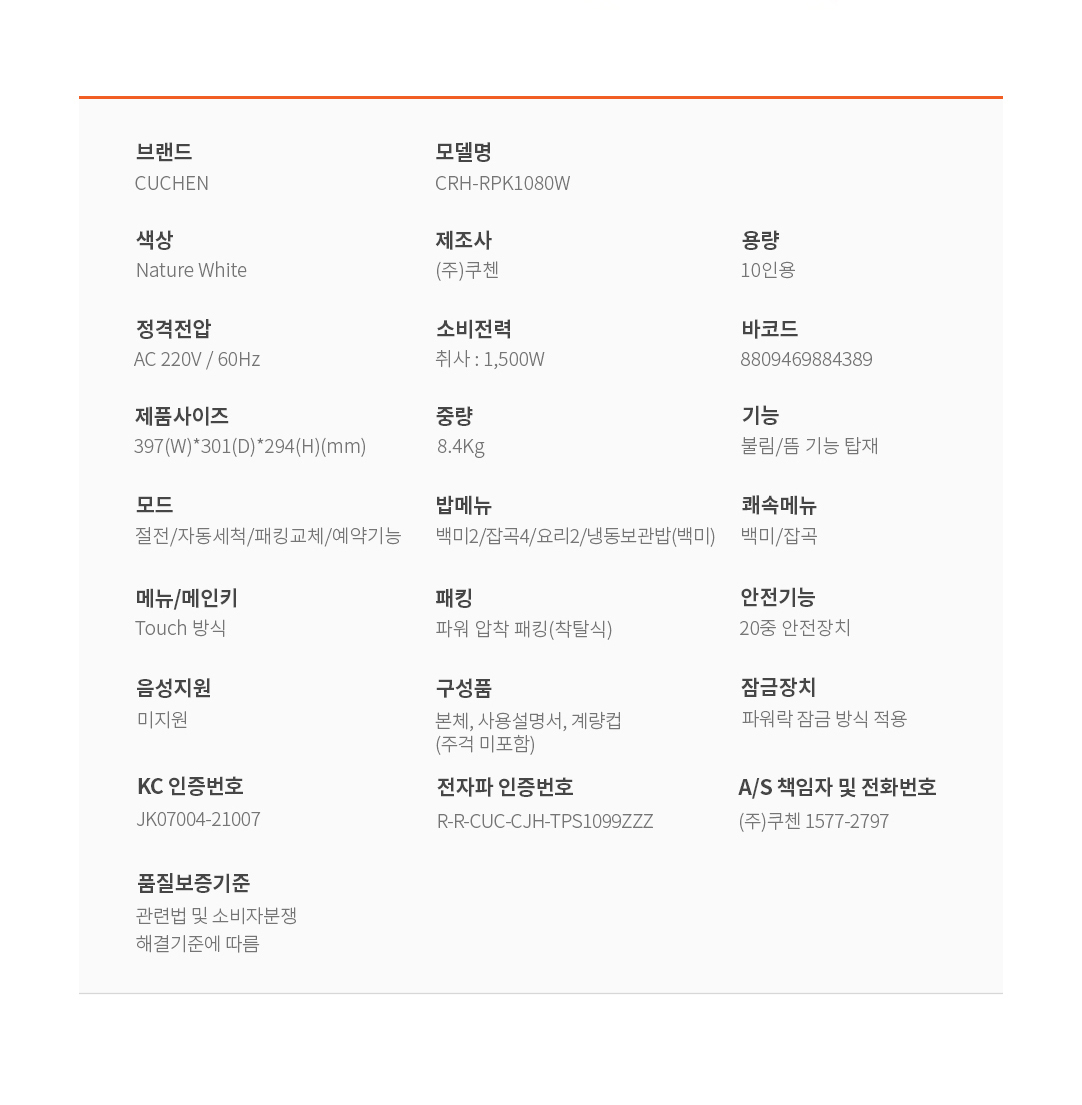 [쿠첸] 2.1 초고압 121 라이트 IH 전기압력밥솥 10인용 CRH-RPK1080W