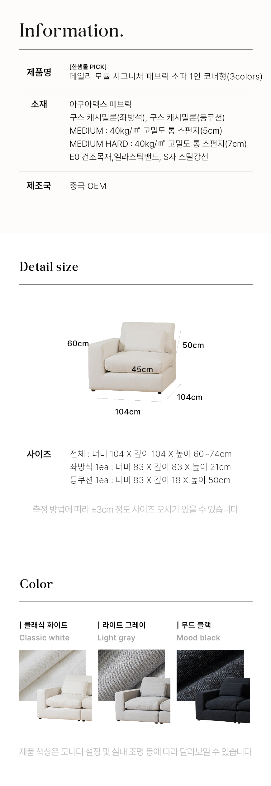 (한샘몰pick) 데일리 구스 모듈 시그니처 패브릭소파 1인 코너형 (3colors)