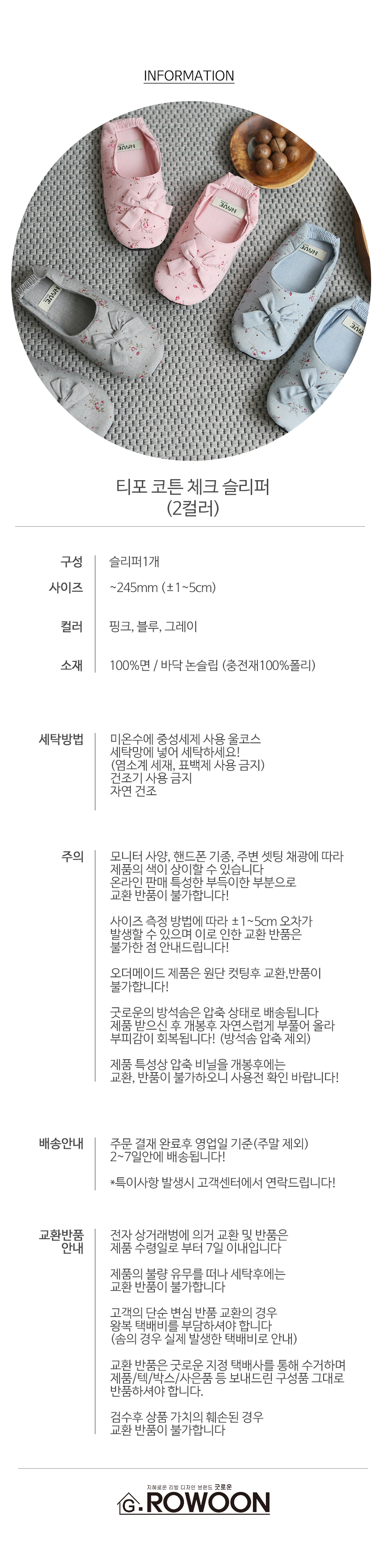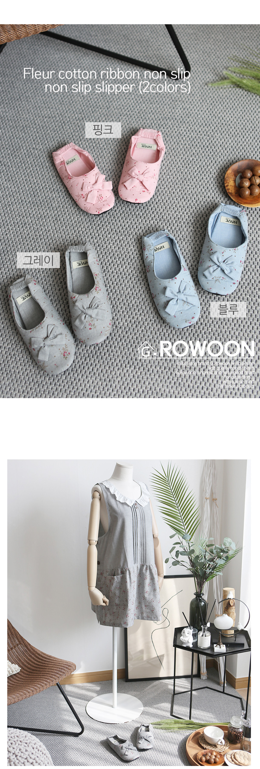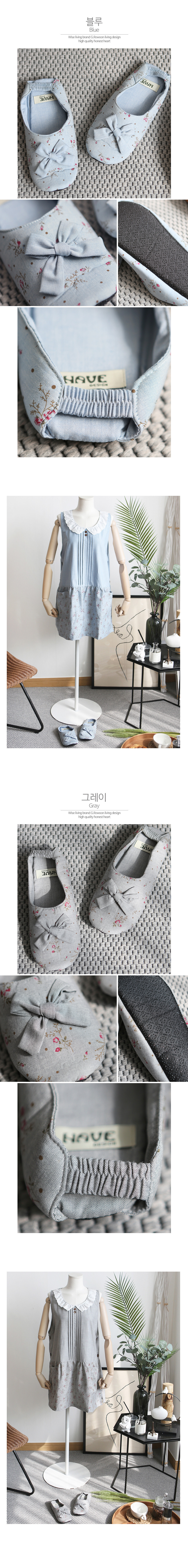 [ 사랑스런 플라워 패브릭 / 리본 포인트 / 뒷면 밴딩 디테일 / 뒷면논슬립 / ~245mm / 가볍고 편안한 착용감 / 카페 공방 주방 바리스타 신혼집 선물 인테리어 슬리퍼 / 2컬러 ]