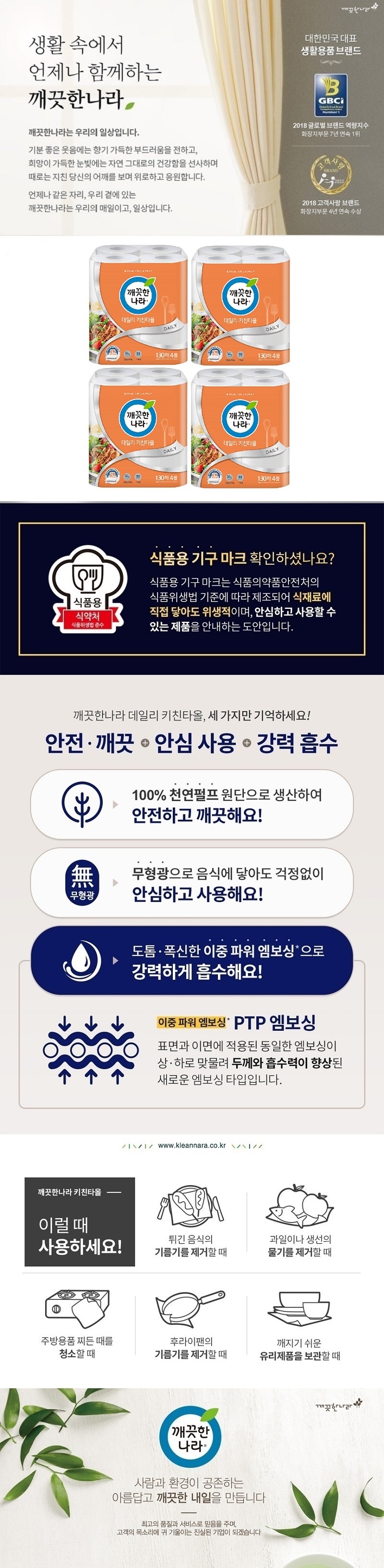 [깨끗한나라] 2겹 천연펄프 더블에어홀 데일리 130매 4롤 X 4팩 키친타올