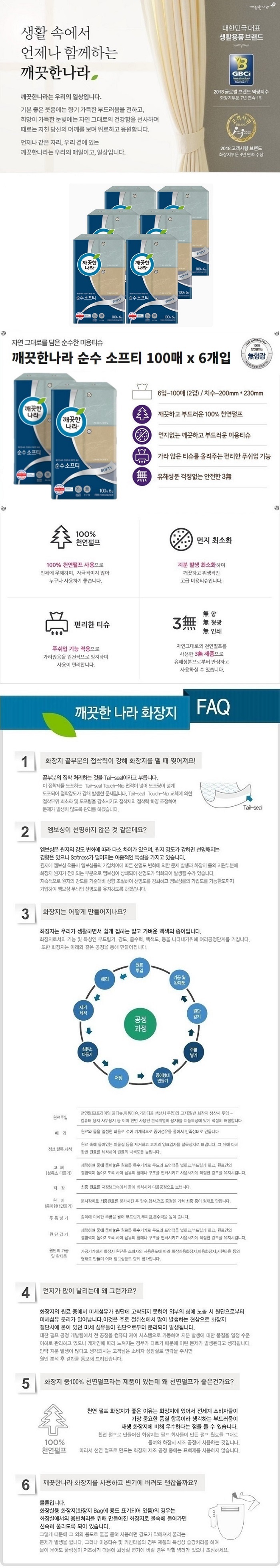 [깨끗한나라] 2겹 천연펄프 순수소프티 100매 6입 X 6팩 미용티슈