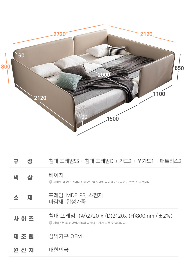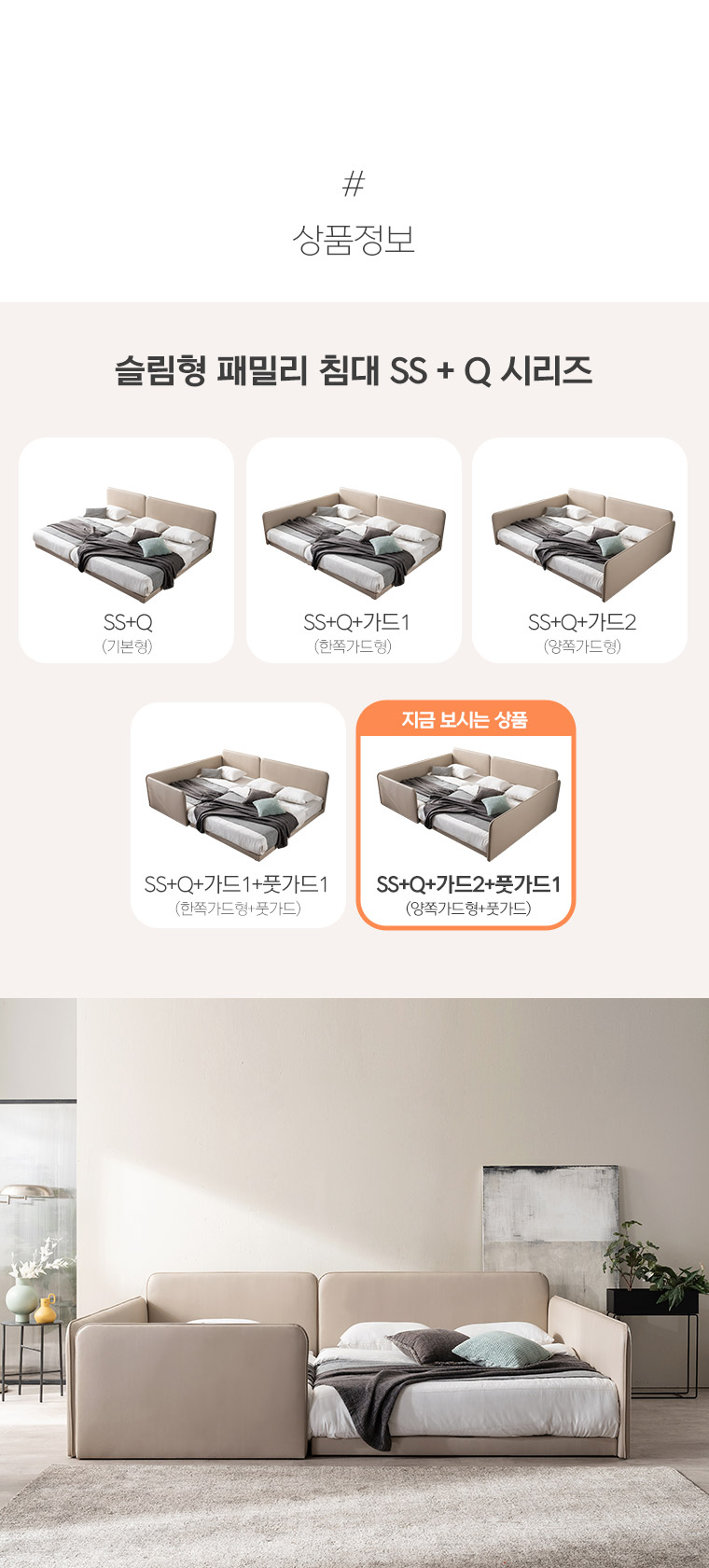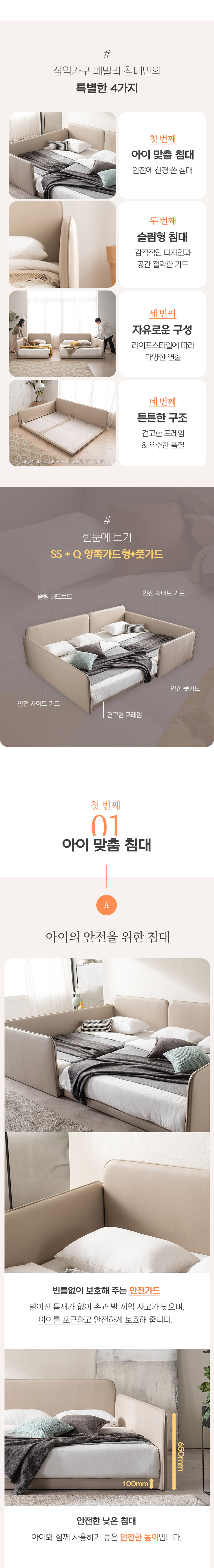 삼익가구 루시 슬림형 저상형 패밀리 침대 SS+Q(7존 독립 매트리스)+가드2+풋가드1