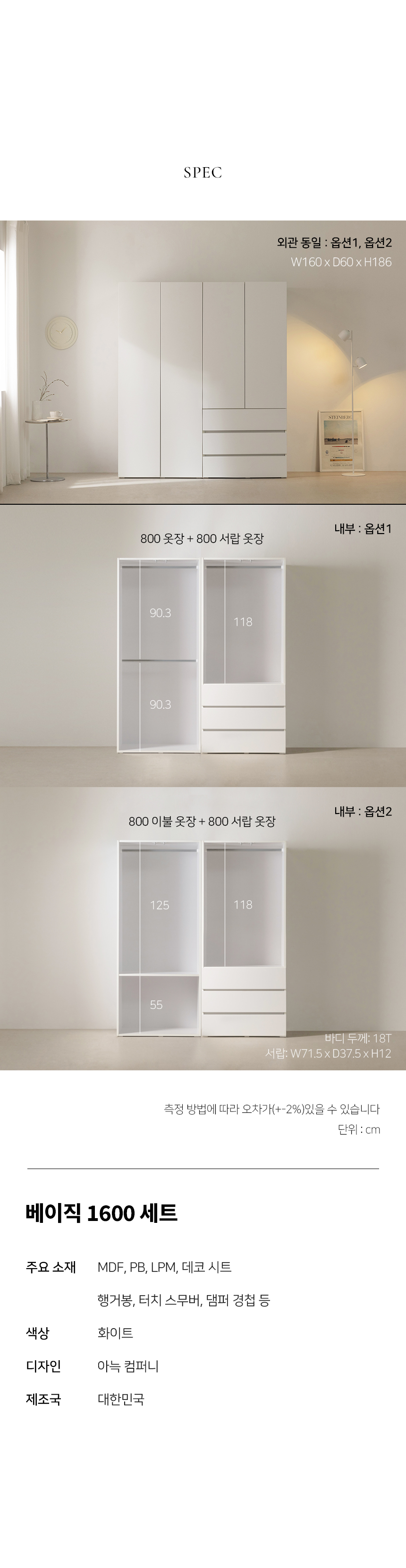 아늑 베이직 터치 1600 세트(옷장/이불장+서랍옷장)