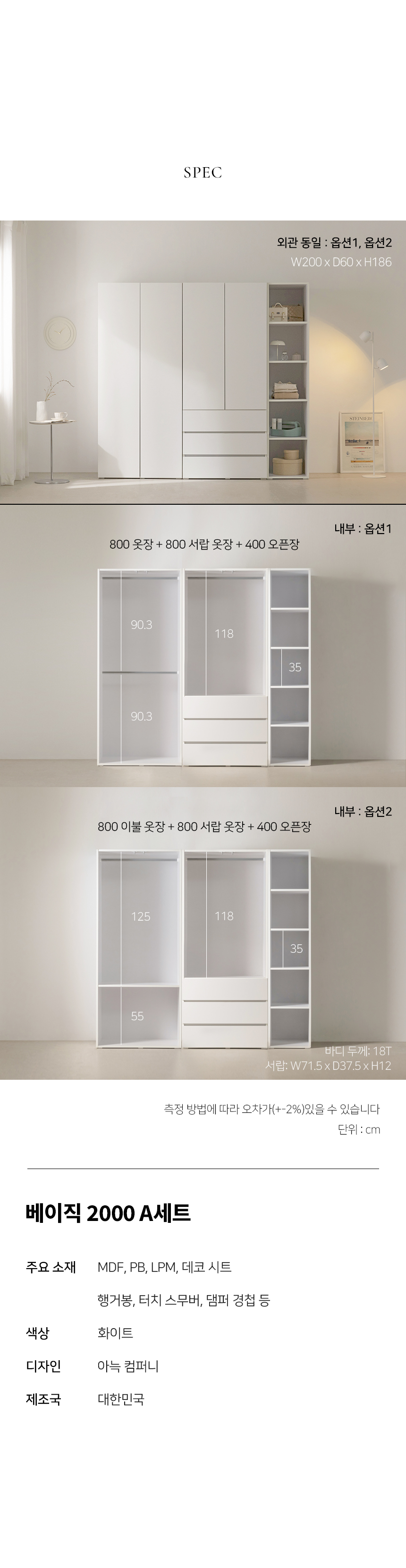 아늑 베이직 터치 2000 A세트 (옷장/이불장+서랍형+오픈장)