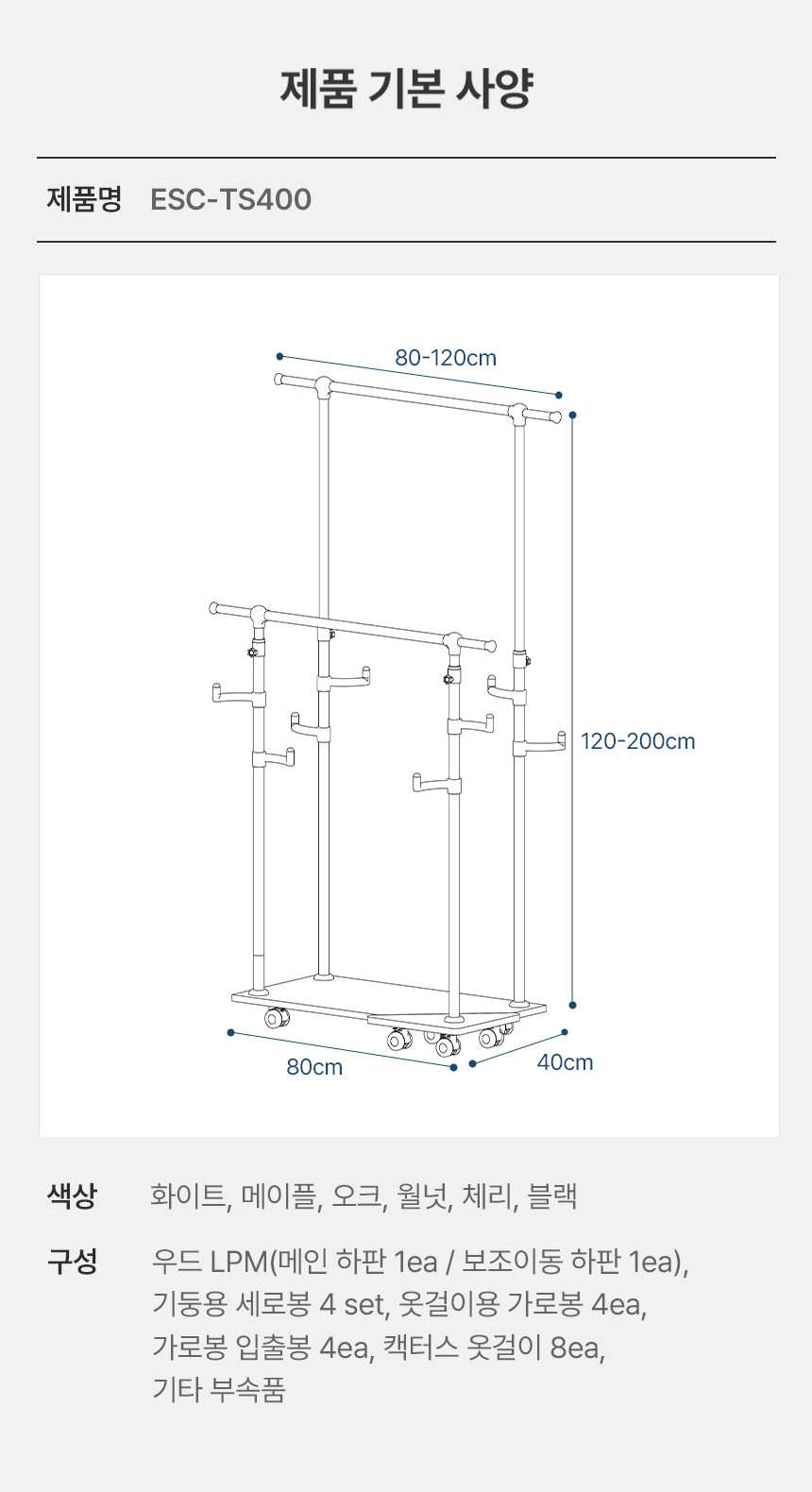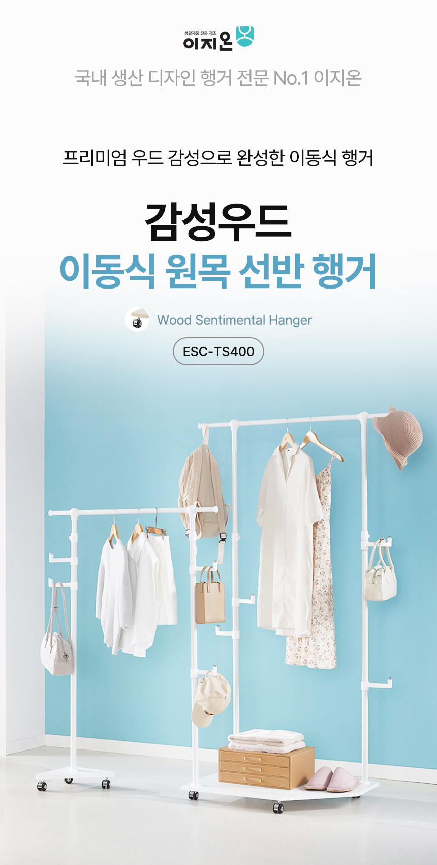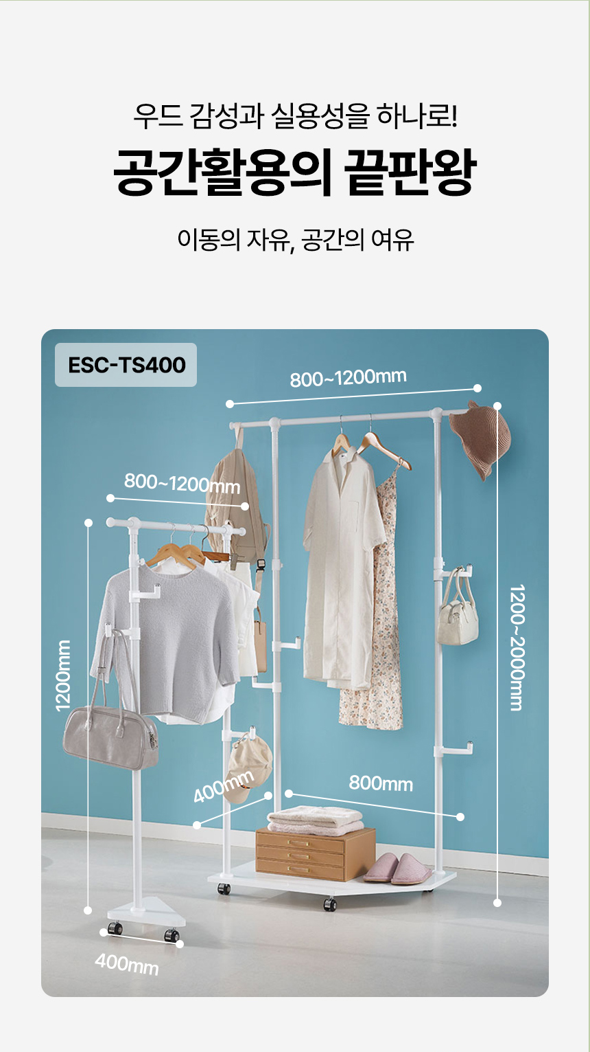 국민튼튼 이동식 스탠드 2단 행거 ESC-TS400 원목 선반
