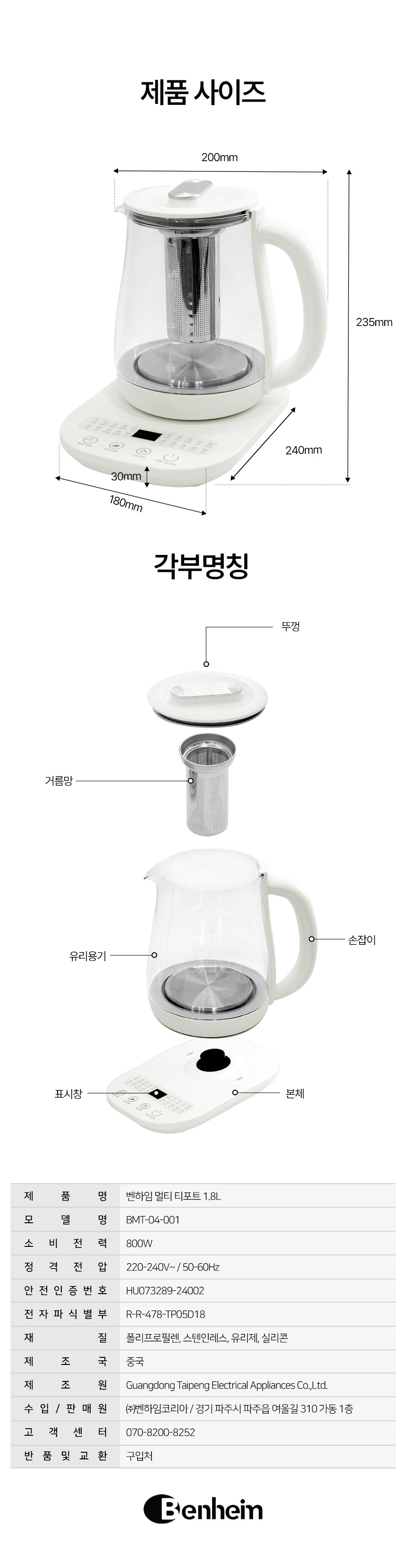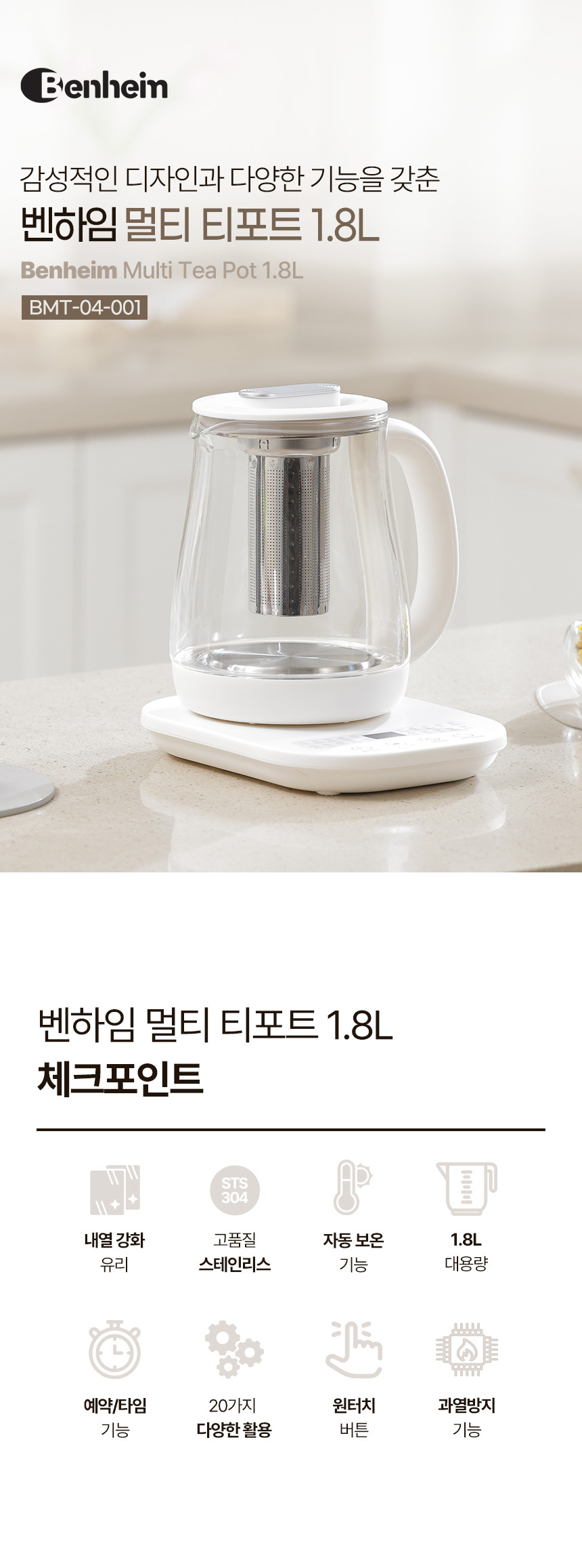 [패밀리] 벤하임 멀티 티포트 1.8L BMT-04-001 유리 전기포트 차탕기 분유포트기
