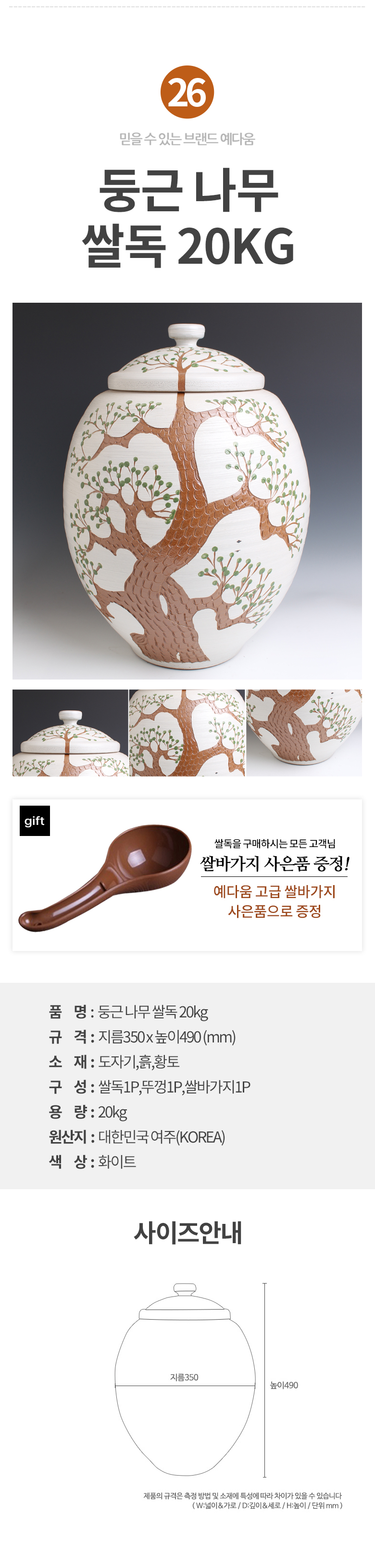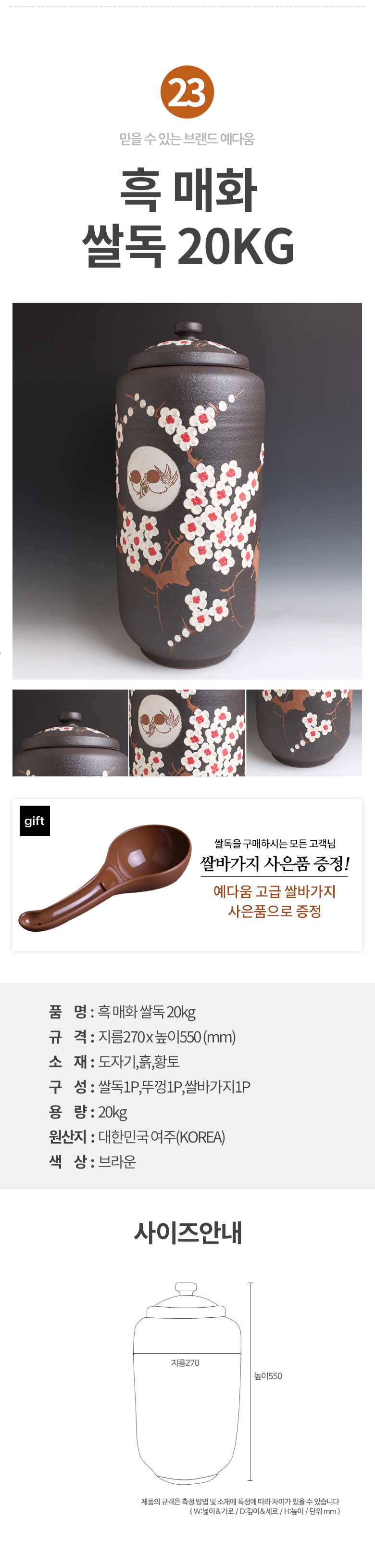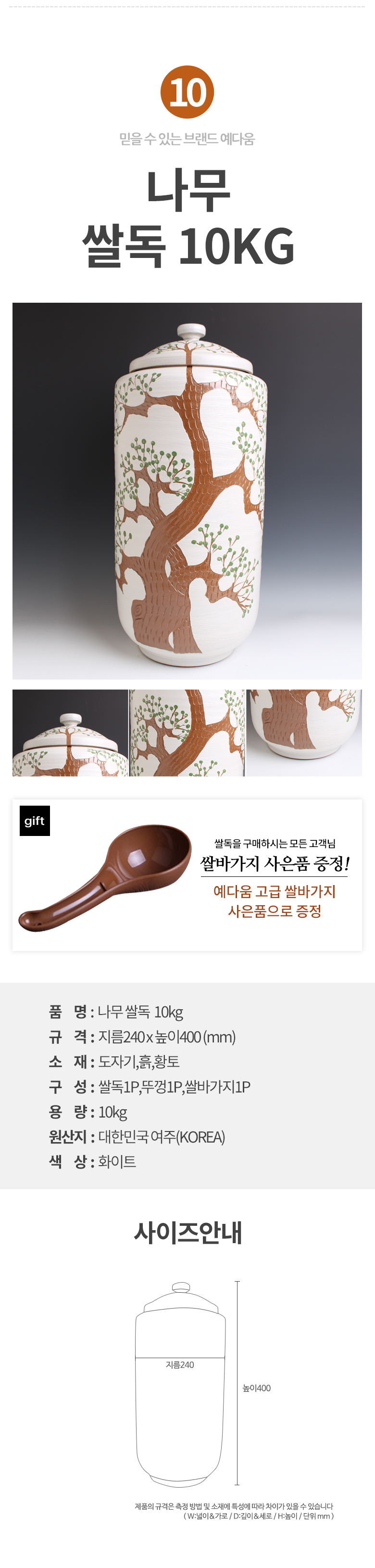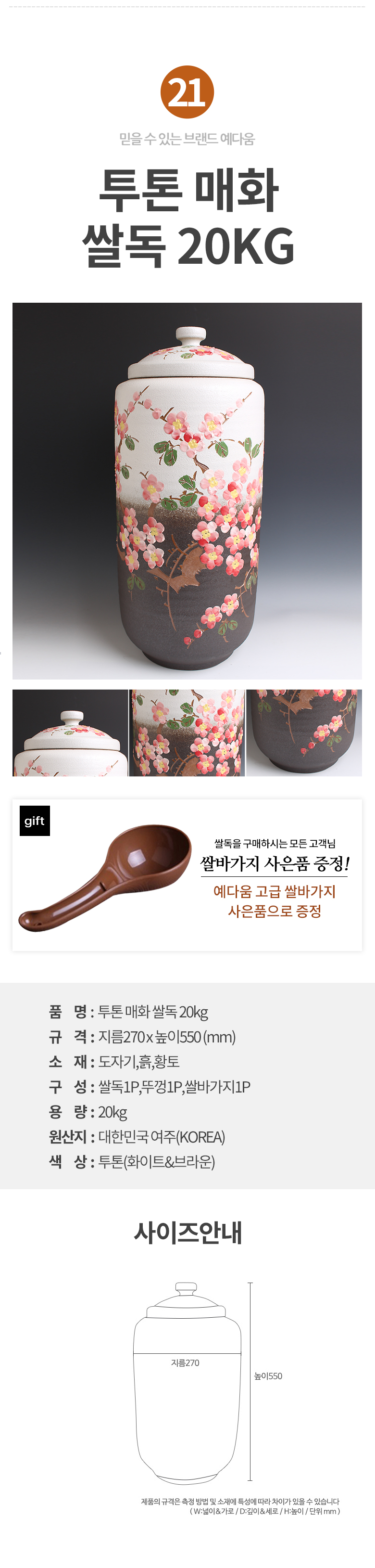 예다움 쌀통 쌀독 쌀 뒤주 보관통 항아리 20kg 10kg