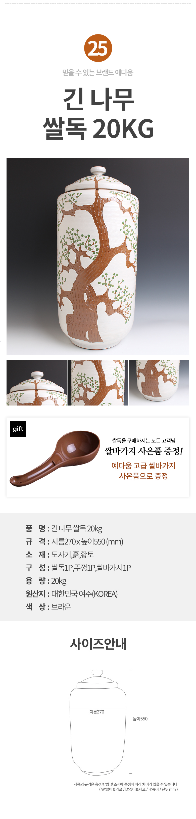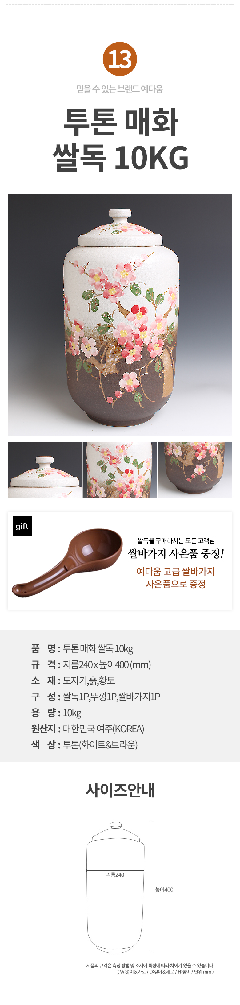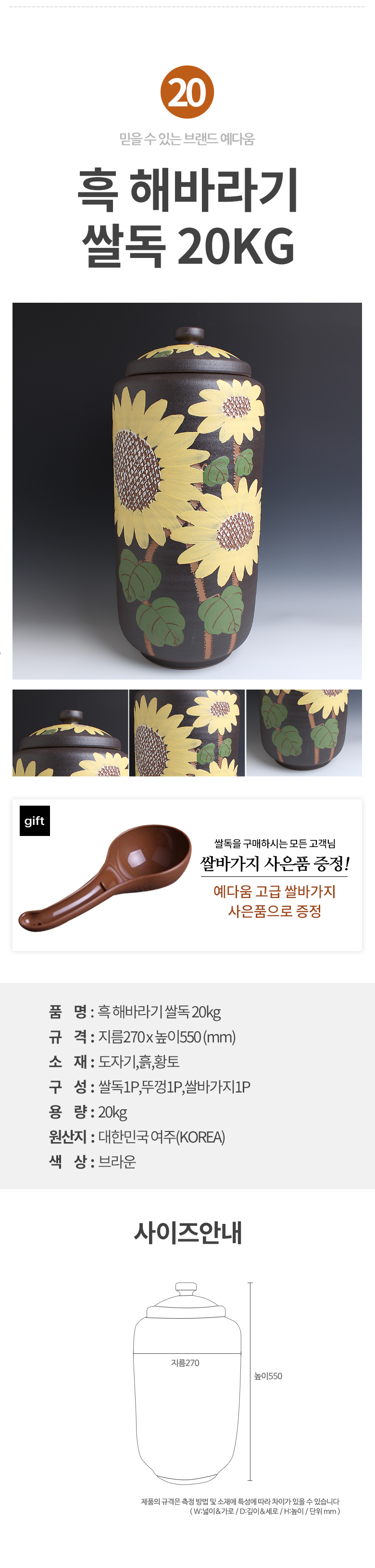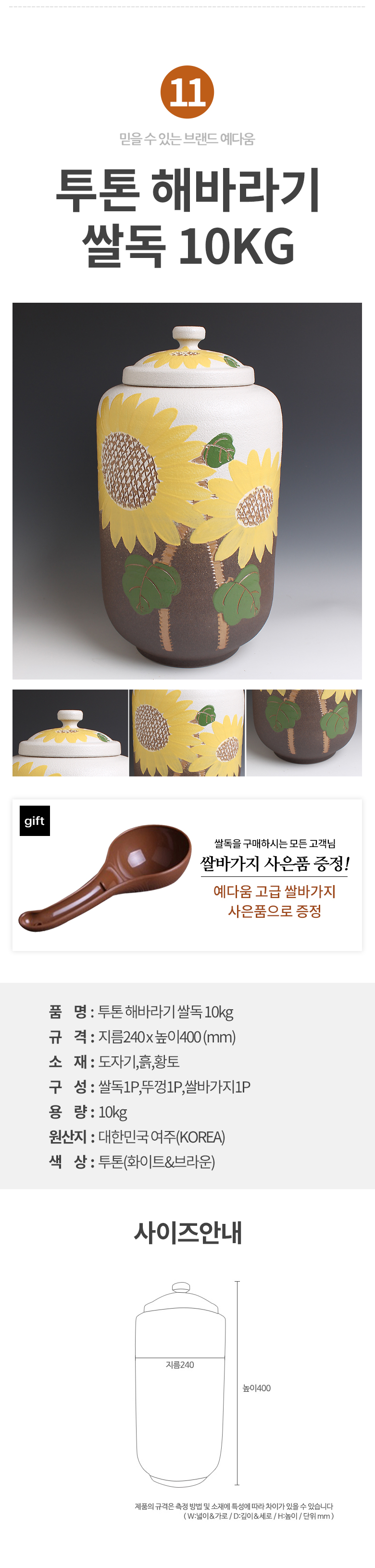 예다움 쌀통 쌀독 쌀 뒤주 보관통 항아리 20kg 10kg