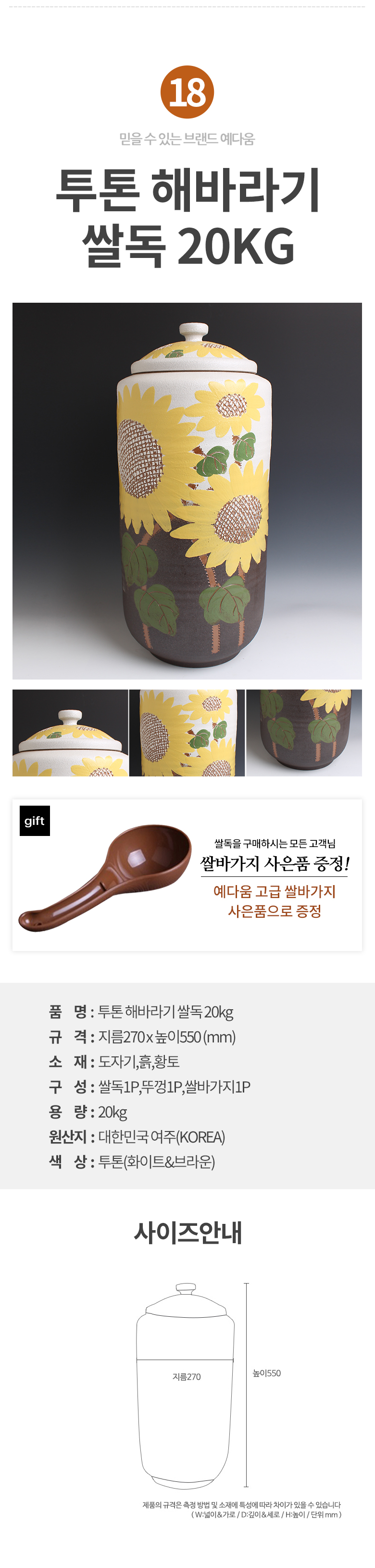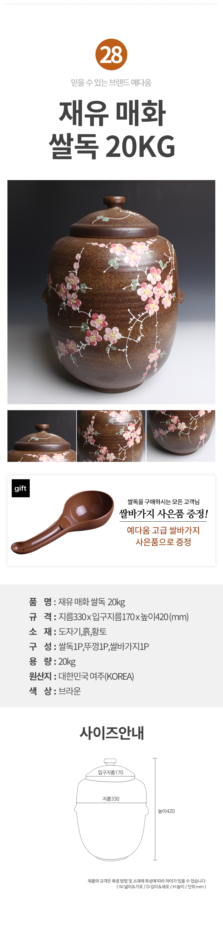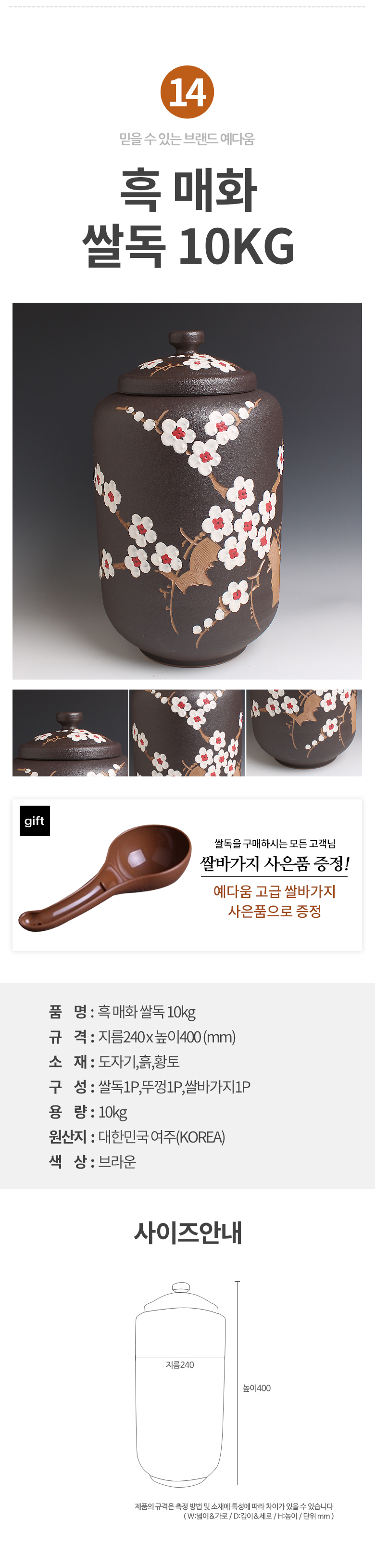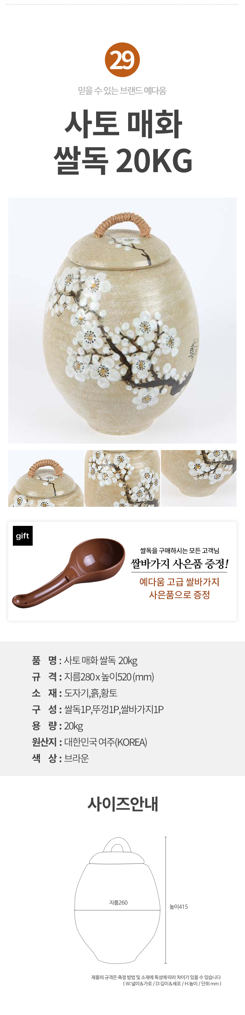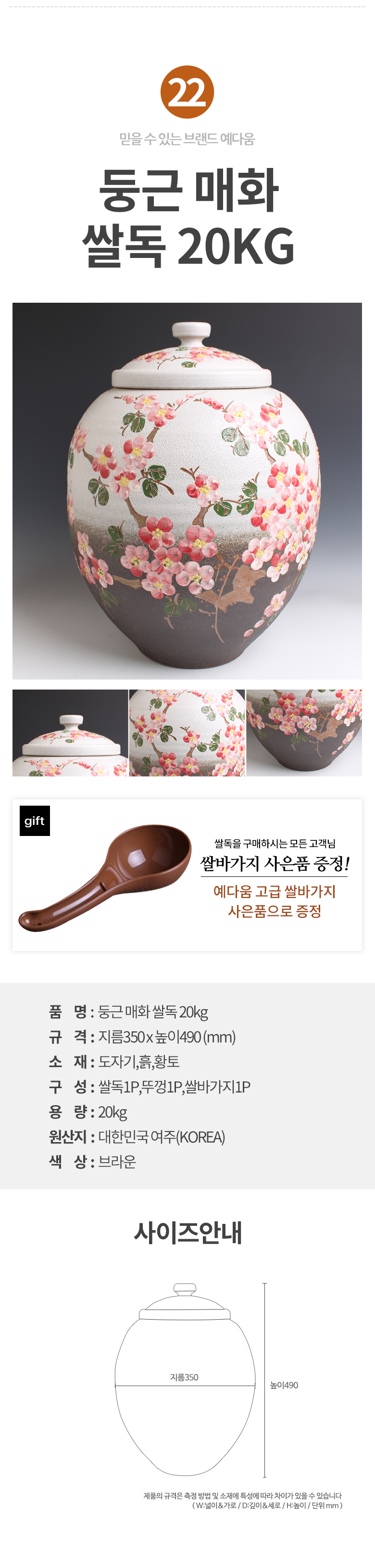 예다움 쌀통 쌀독 쌀 뒤주 보관통 항아리 20kg 10kg