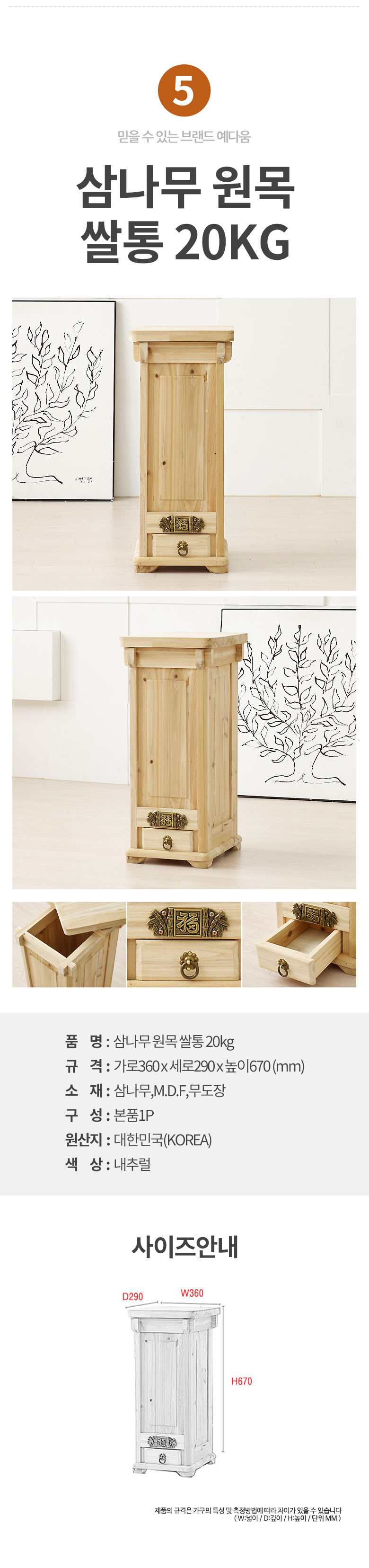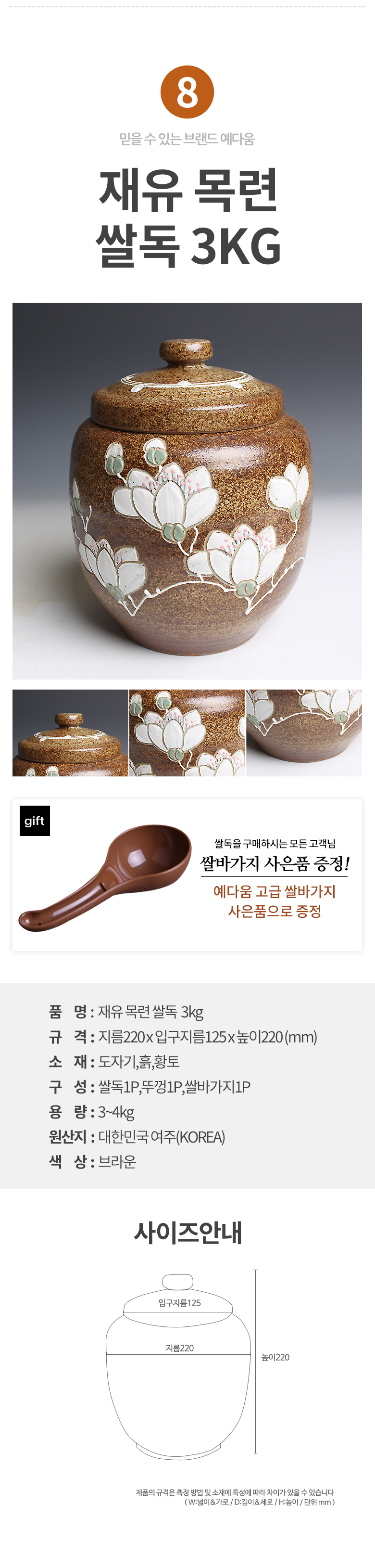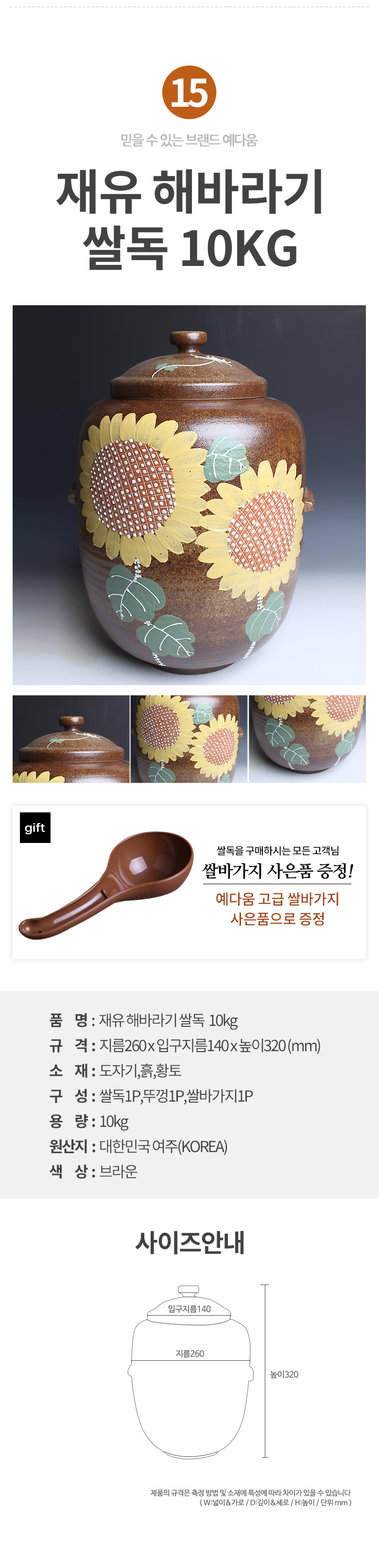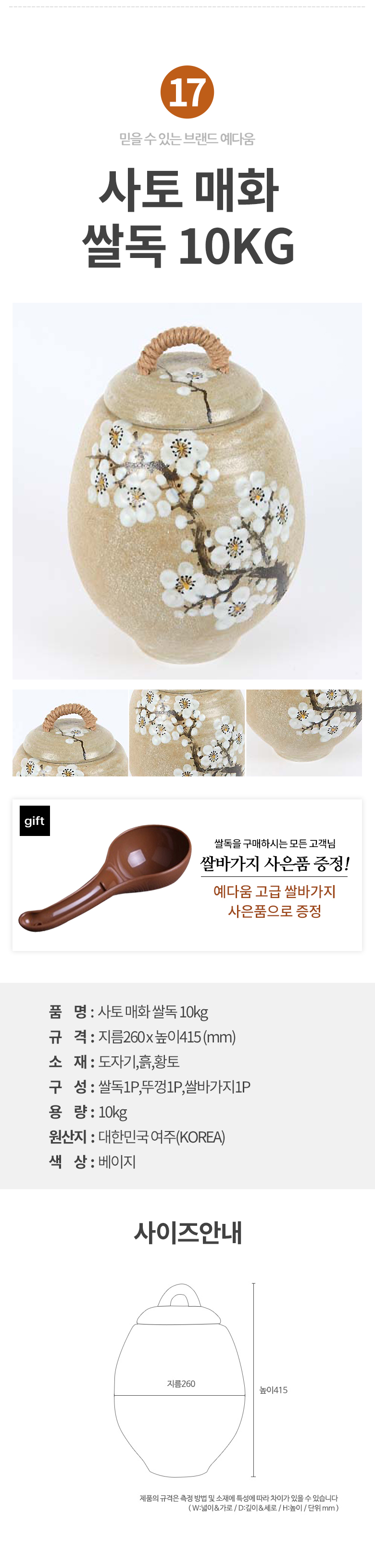 예다움 쌀통 쌀독 쌀 뒤주 보관통 항아리 20kg 10kg