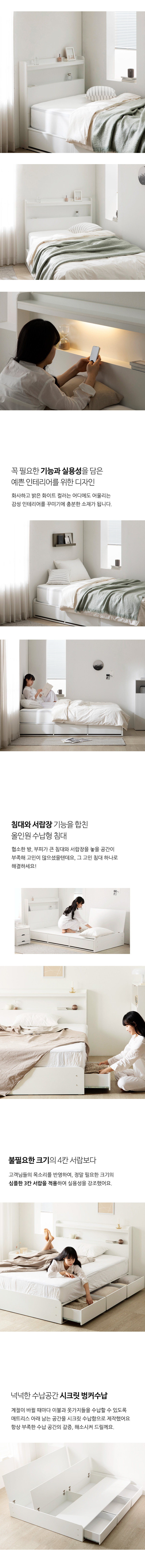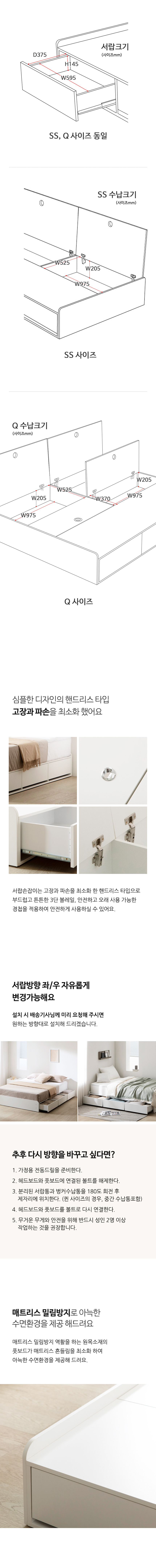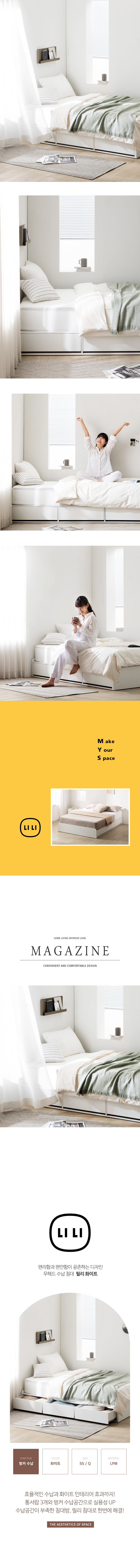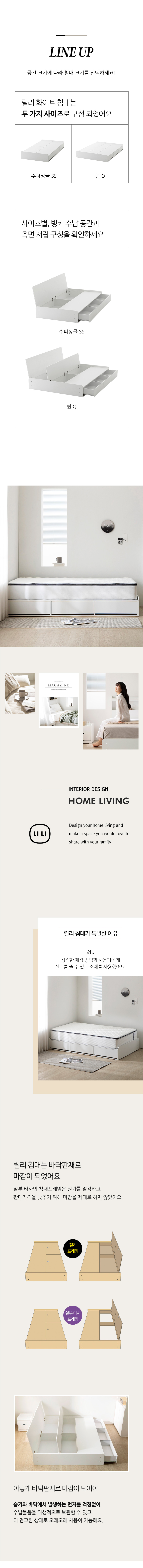 밀랑 릴리 화이트 무헤드 평상형 수납 침대 프레임 SS Q