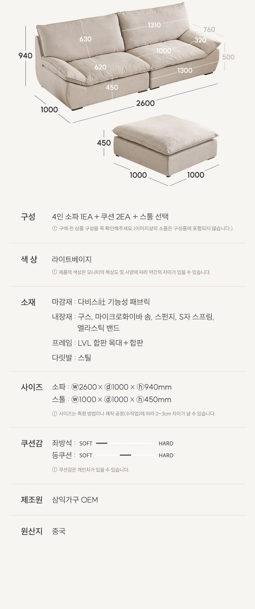 삼익가구 두모브 구스 패브릭 2인용/4인용 소파(스툴선택)