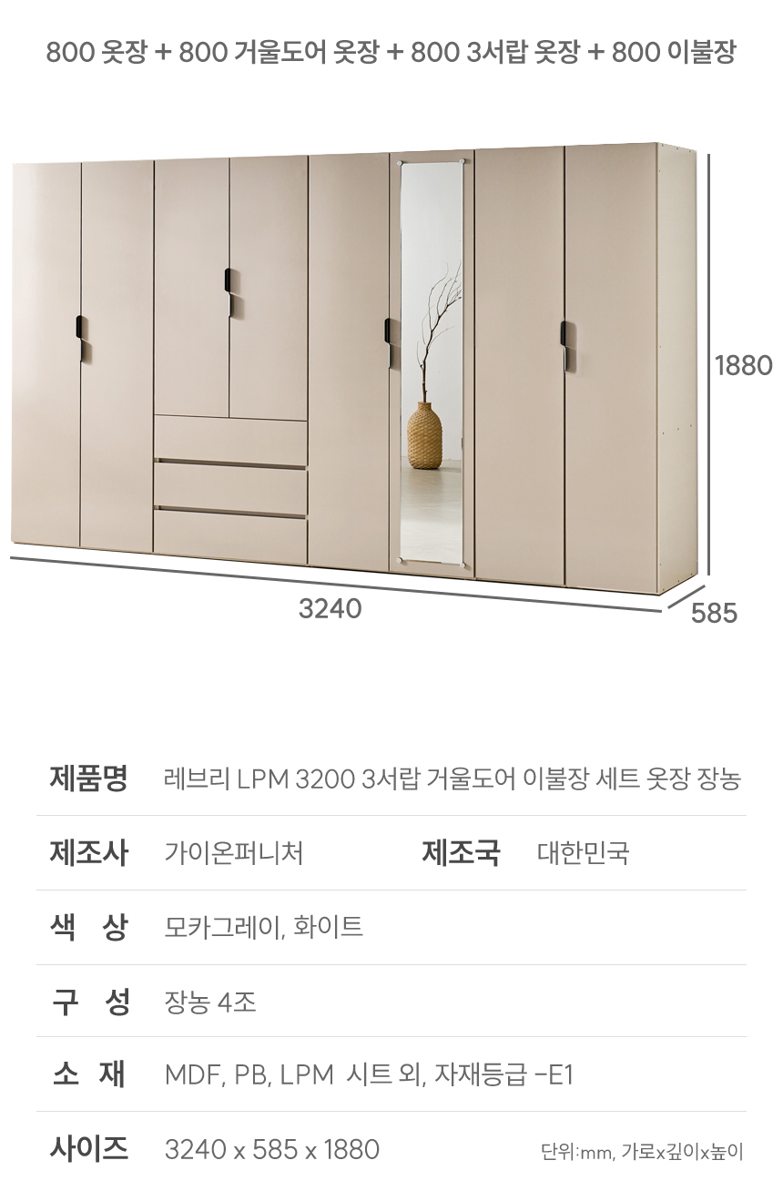 레브리 LPM 3200 3서랍 거울도어 이불장 세트 옷장 장농