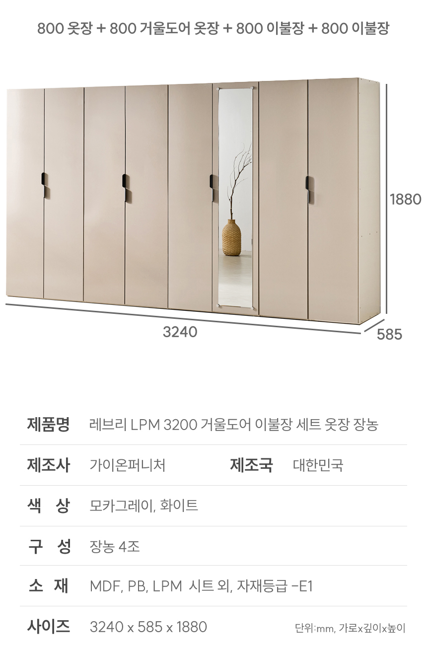 레브리 LPM 3200 거울도어 이불장 세트 옷장 장농