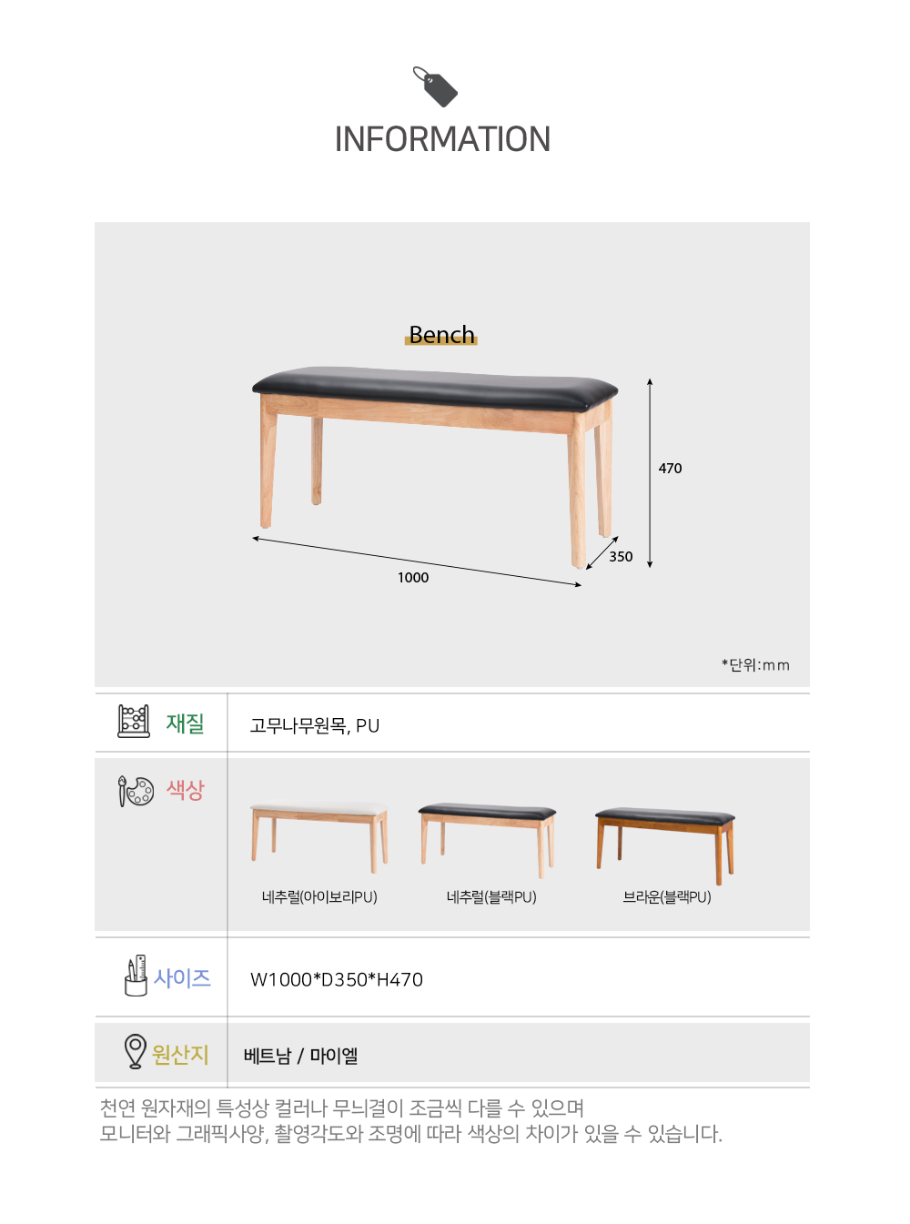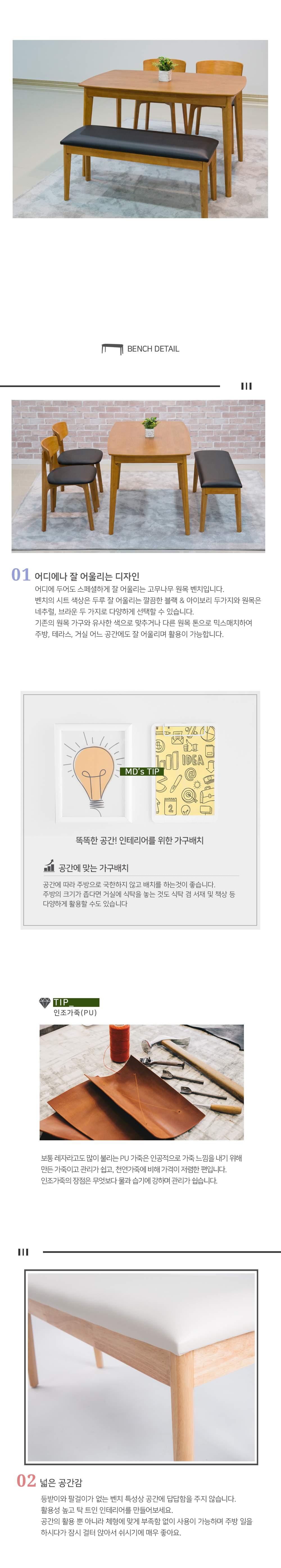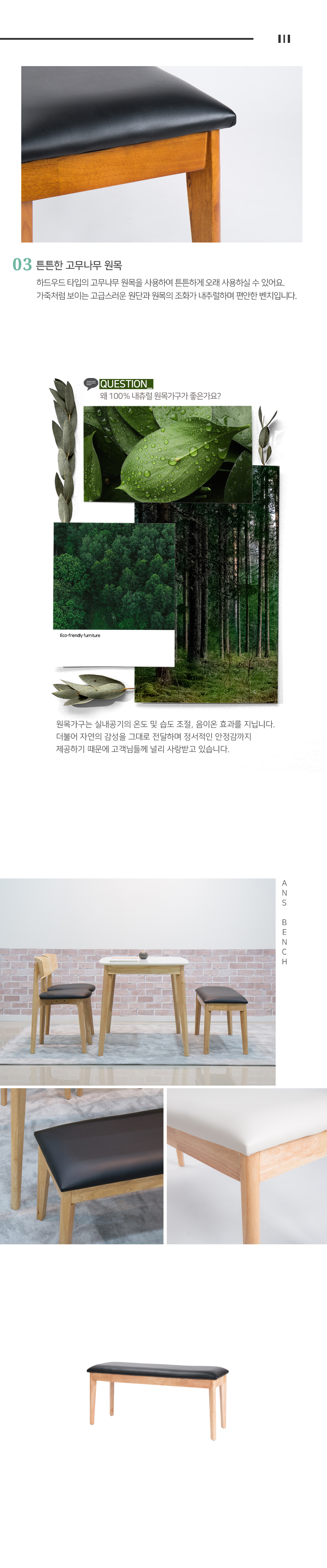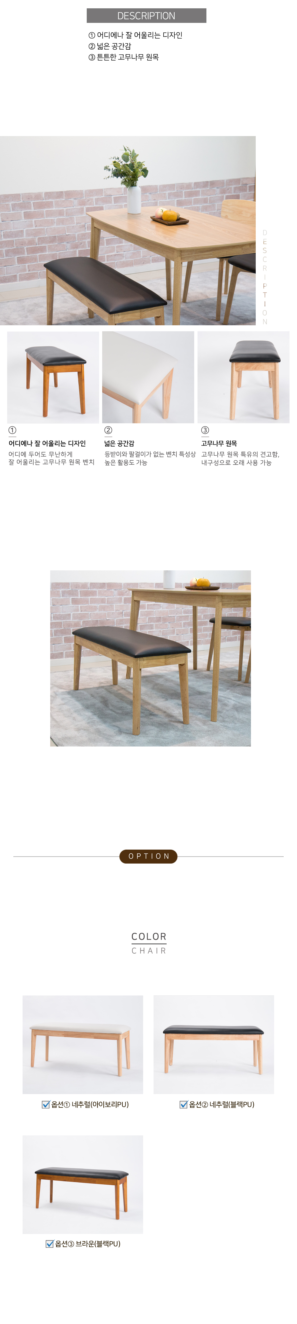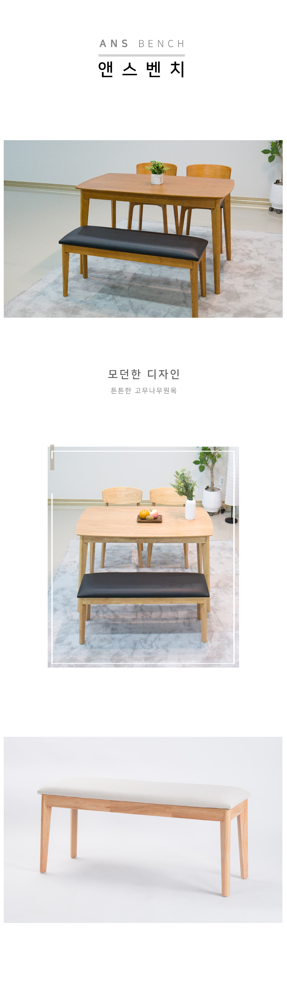 #어디에도 잘 어울리는 디자인어디에 두어도 스페셜하게 잘 어울리는 고무나무 원목 벤치입니다. 벤치의 시트 색상은 두루 잘 어울리는 깔끔한 블랙 & 아이보리 두가지와 원목은 네추럴, 브라운 두 가지로 다양하게 선택할 수 있습니다.기존의 원목 가구와 유사한 색으로 맞추거나 다른 원목 톤으로 믹스매치하여 주방, 테라스, 거실 어느 공간에도 잘 어울리며 활용이 가능합니다. #넓은 공간감등받이와 팔걸이가 없는 벤치 특성상 공간에 답답함을 주지 않습니다. 활용성 높고 탁 트인 인테리어를 만들어보세요.공간의 활용 뿐 아니라 체형에 맞게 부족함 없이 사용이 가능하며 주방 일을 하시다가 잠시 걸터 앉아서 쉬시기에 매우 좋아요. #고무나무 원목하드우드 타입의 고무나무 원목을 사용하여 튼튼하게 오래 사용하실 수 있어요.가죽처럼 보이는 고급스러운 원단과 원목의 조화가 내추럴하며 편안한 벤치입니다.
