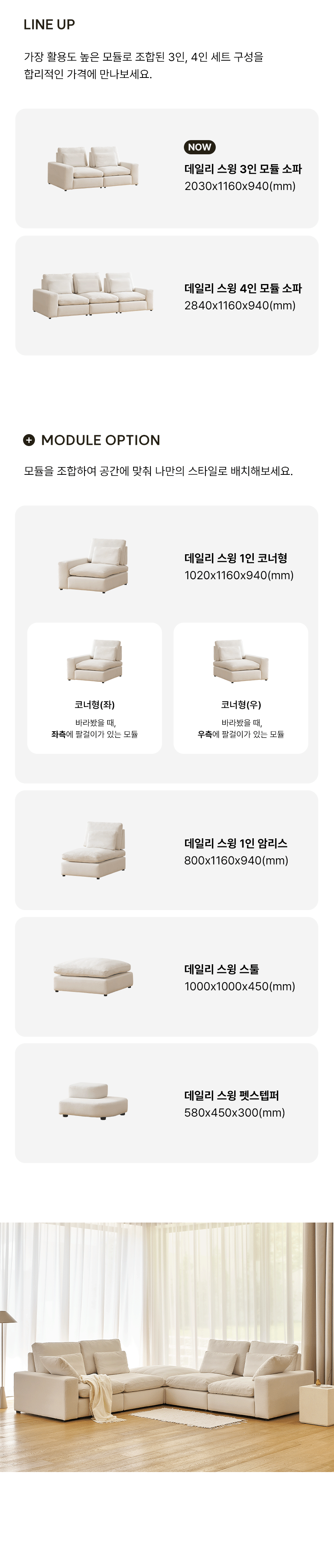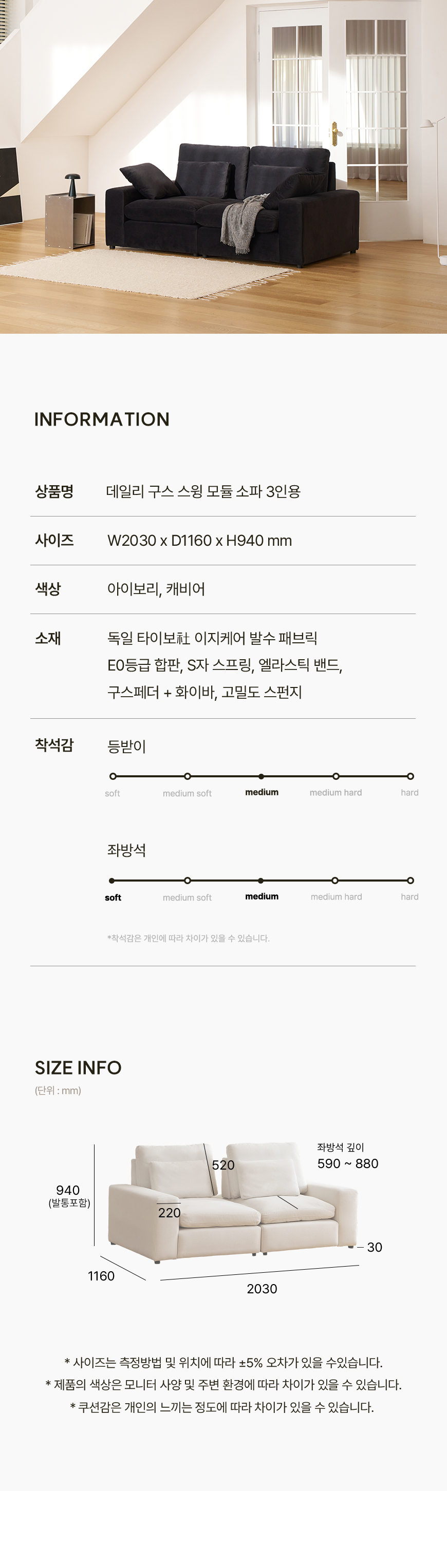 (한샘몰pick) 데일리 스윙 구스 모듈 타이보텍스 패브릭소파 3인용 (2colors)