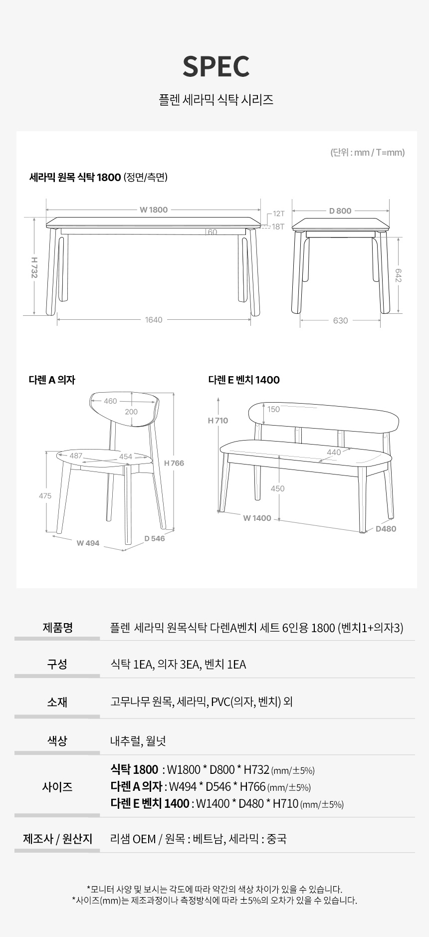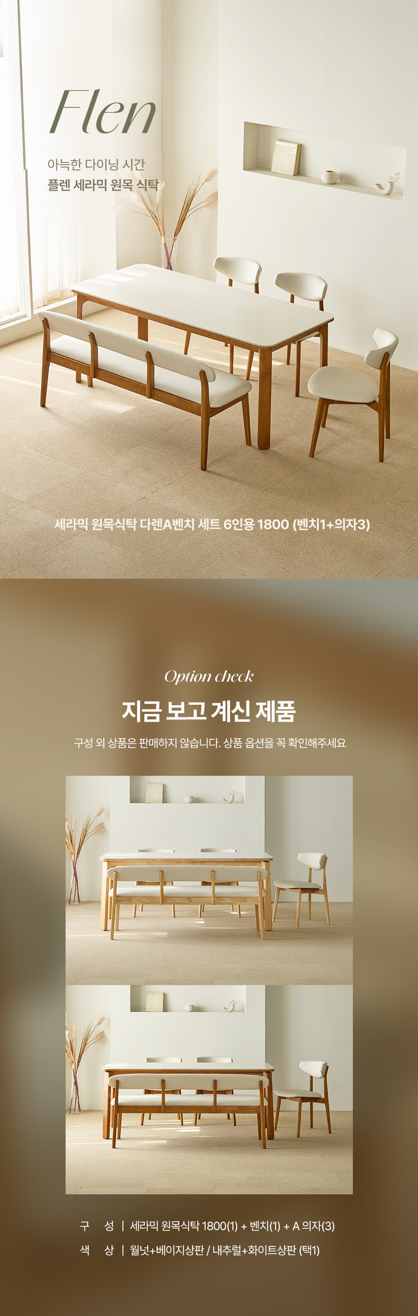 파로마 플렌 세라믹 원목식탁 다렌A벤치 세트 6인용 1800 (벤치의자1의자3)