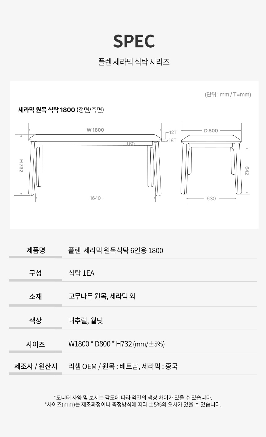 파로마 플렌 세라믹 원목식탁 6인용 1800 2colors