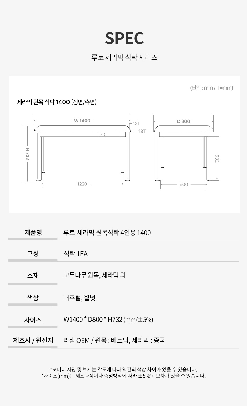 파로마 루토 세라믹 원목식탁 4인용 1400 2colors