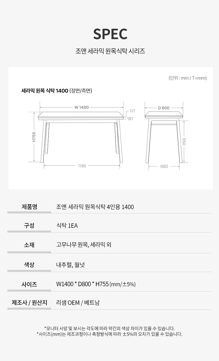파로마 조앤 세라믹 원목식탁 4인용 1400 2colors