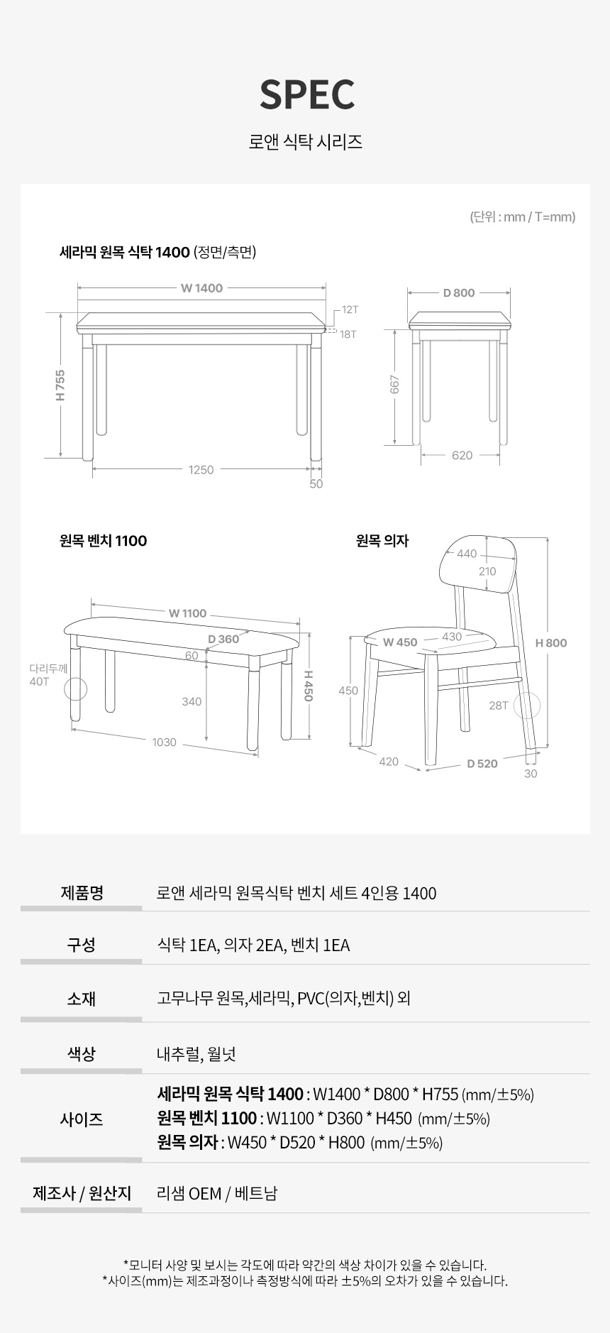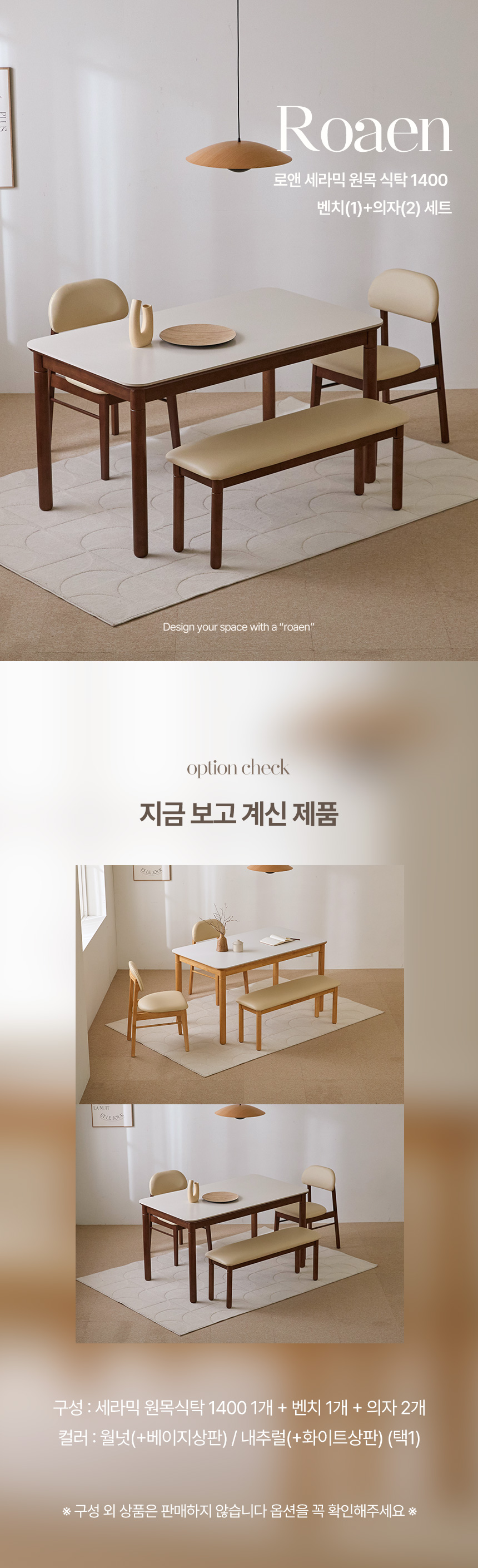 파로마 로앤 세라믹 원목식탁 벤치 세트 4인용 1400 (벤치1 의자2)