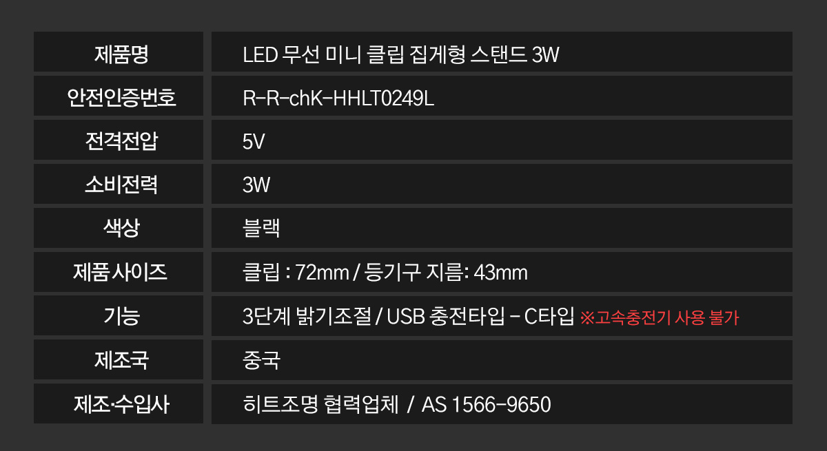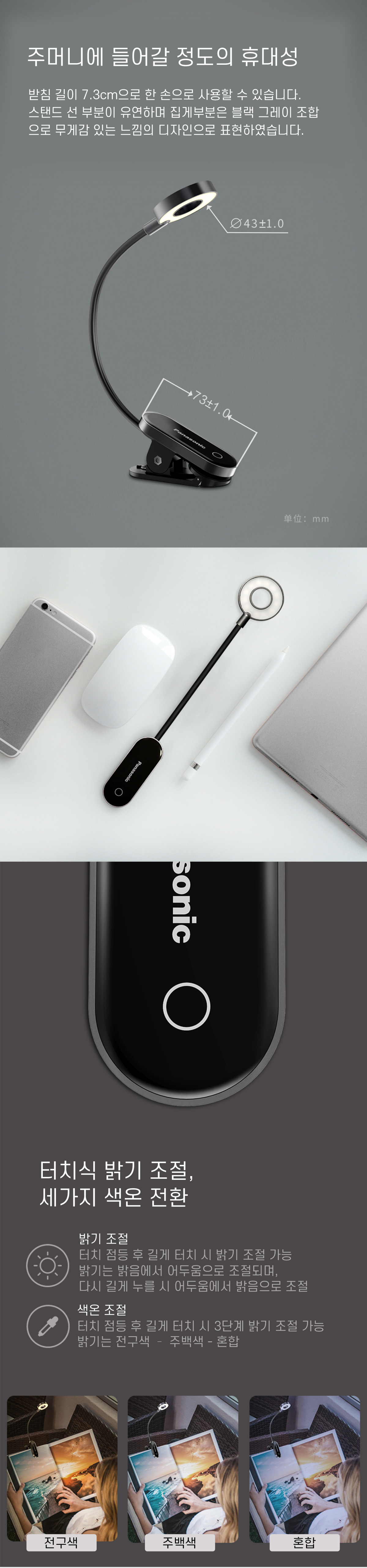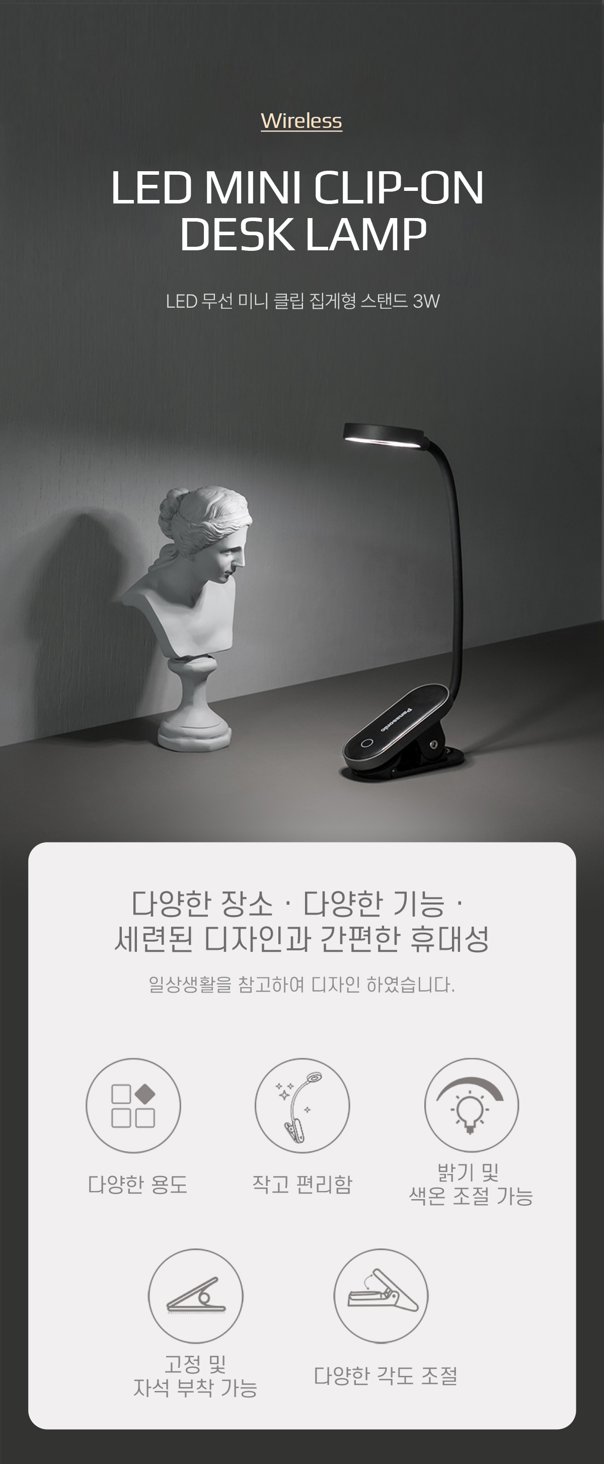 LED 무선 미니 클립 집게형 스탠드 3W USB충전형 삼색변환 밝기조절