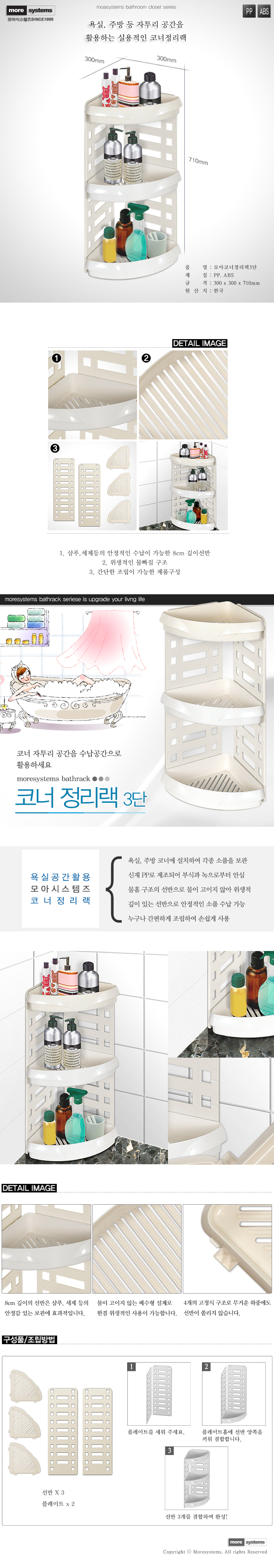 모아시스템즈 모아 코너정리랙 3단 욕실선반 욕실수납 코너선반