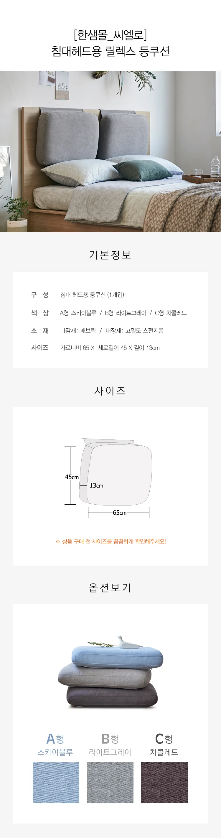 (한샘몰 pick) 침대헤드용 릴렉스 등쿠션