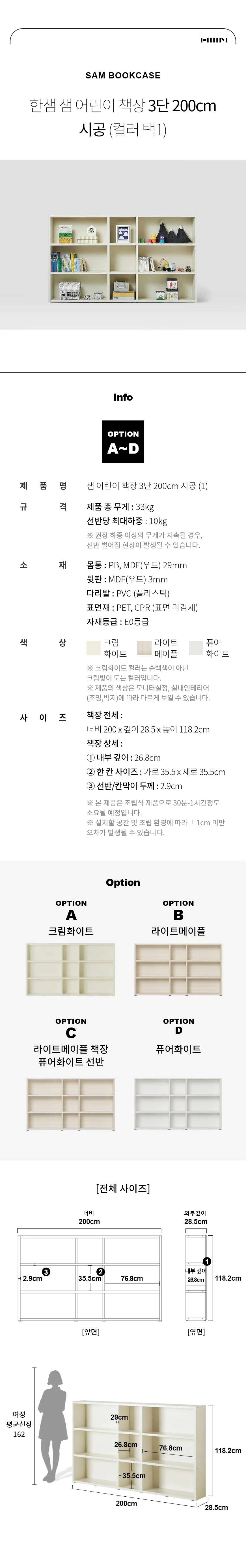 샘 어린이책장 3단 200cm 시공 (컬러 택1)
