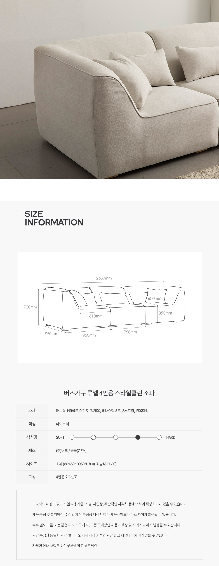 버즈가구 루멜 4인용 스타일클린 워셔블 패브릭소파 (BS949)