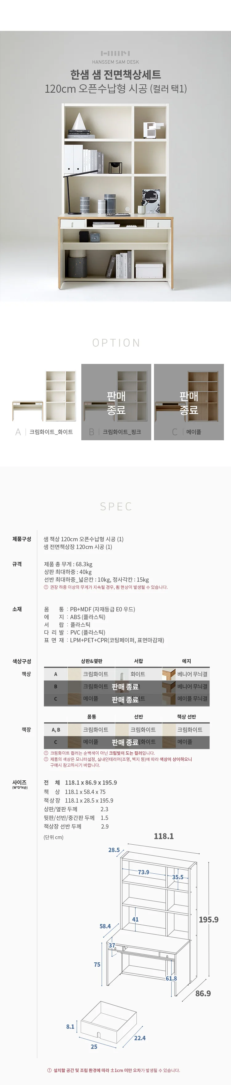 샘 전면책상세트 120cm 오픈수납형 시공(컬러 택1)