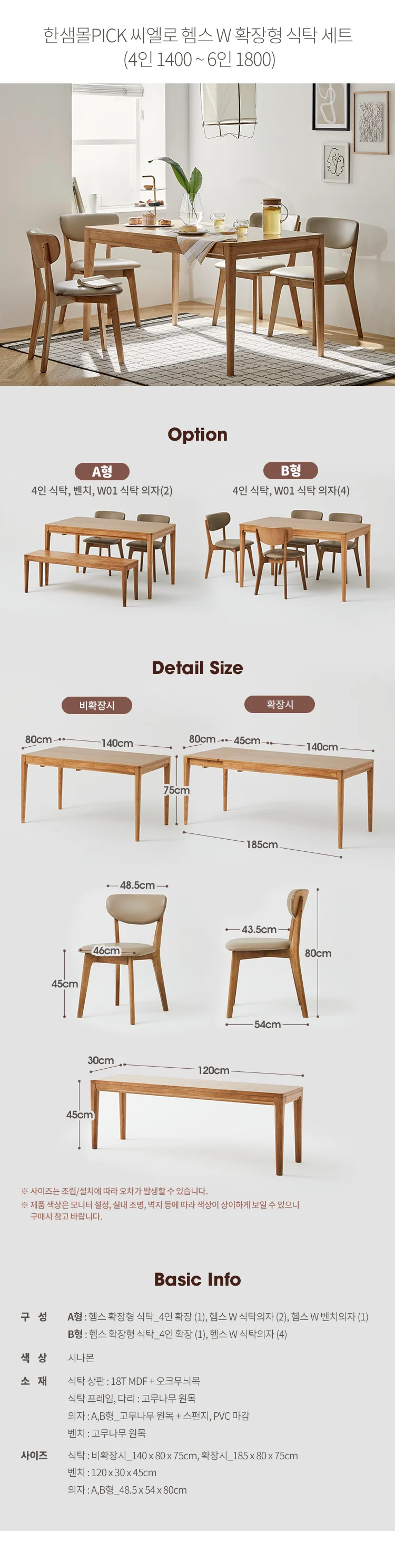 [특가 ~12/22](한샘몰pick) 씨엘로 헴스 W 확장형 식탁세트 4인 6인 원목 1400 1800