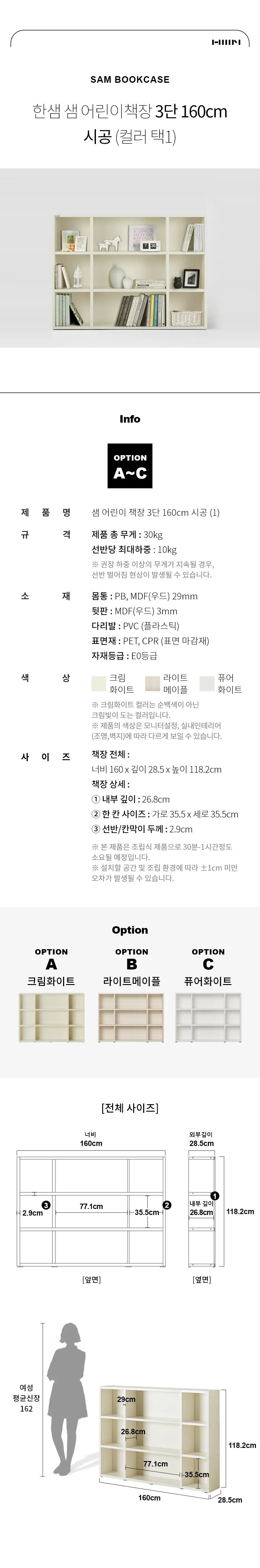 샘 어린이책장 3단 160cm 시공(컬러 택1)
