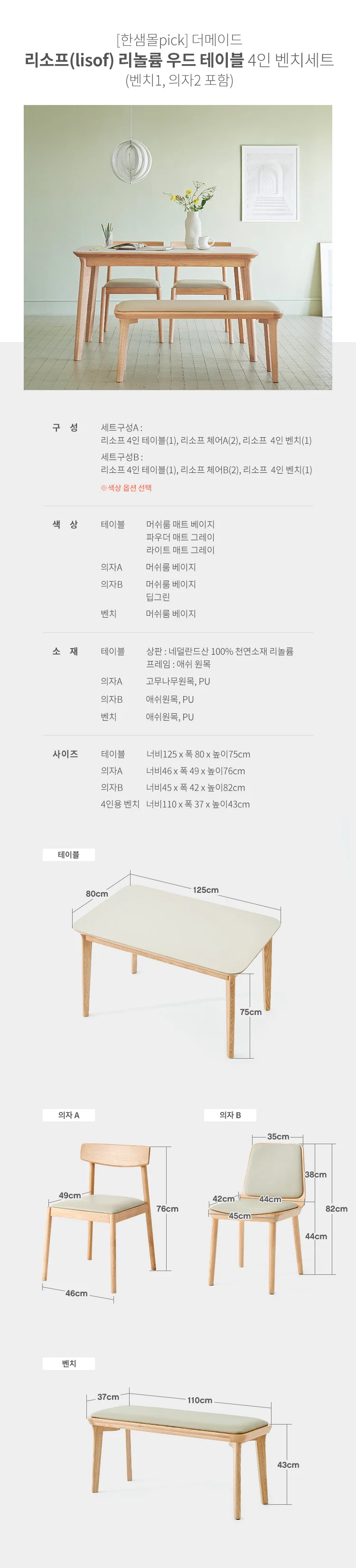 (한샘몰pick) 리소프 리놀륨 4인 원목 식탁 테이블 벤치 세트