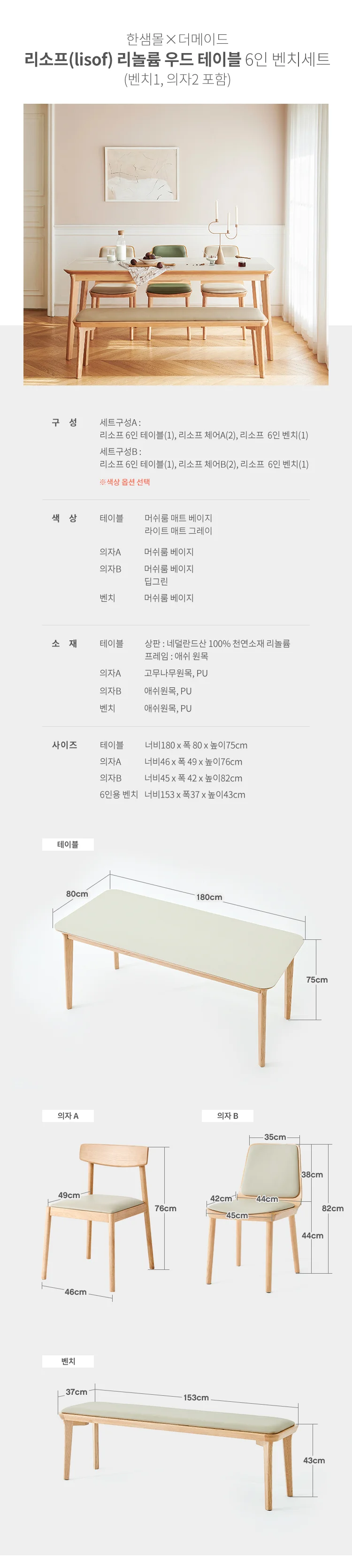 (한샘몰pick) 리소프 리놀륨 6인 원목 식탁 테이블 벤치세트