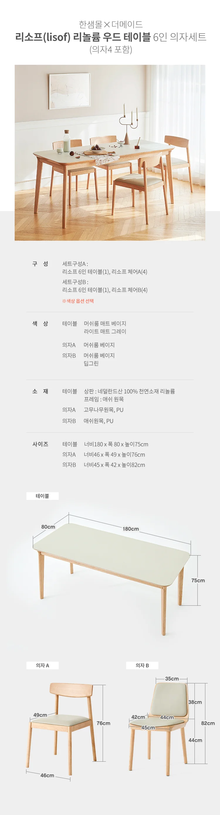 (한샘몰pick) 리소프 리놀륨 6인 원목 식탁 테이블 의자세트