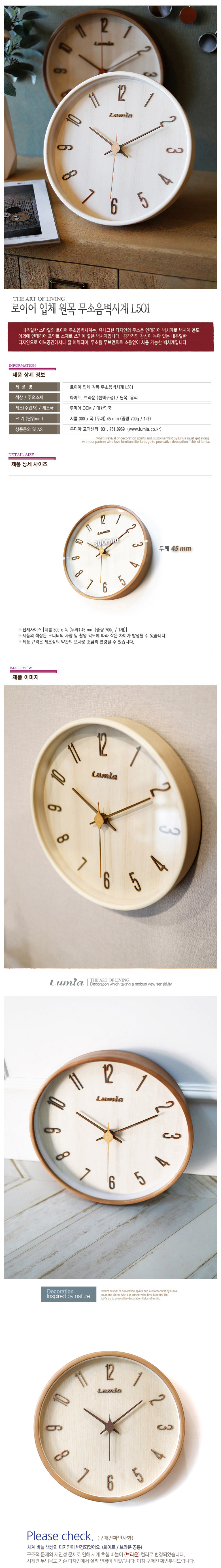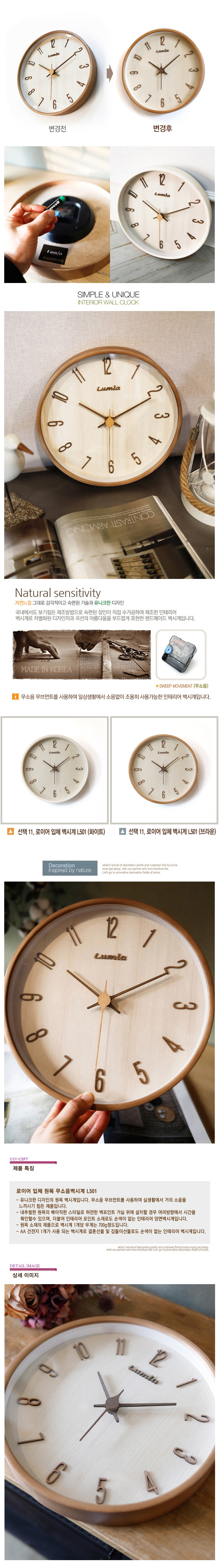 로이어 입체 원목 무소음벽시계 L501