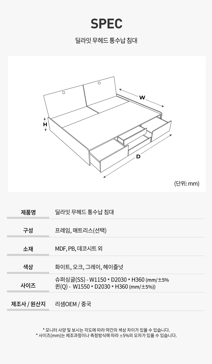 고급 매트리스 반 짝 특 가 / 파로마 딜라잇 무헤드 통수납 침대 SS/Q (매트선택)